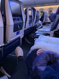 I’m not sure what happened to all the OTHER people who were supposed to make that connection, but when our plane took off it was missing a lot of people. So much so that my wish to have business class was dang near fulfilled, without the cost. I was able to lie down across three seats and slept soundly (with a little help from my friends, of course) for hours. Photo “business class” – the cheap way.