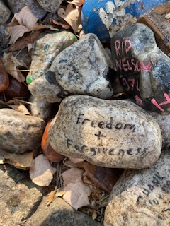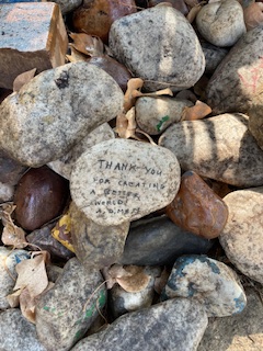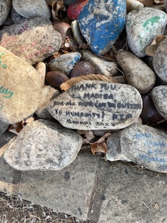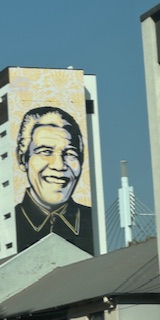He did do that (sorry, no stories of being ripped off or anything). He drove us all around the city, rich areas, poor areas, Nelson Mandela’s home for 11 years after he was released from prison (rich area). The Mandela family still lives there and the trees outside the walls are surrounded by river stones that bear messages of gratitude from visitors. Photos: Our guide Sophi in front of Mandela’s post-release home (he has four daughters – TWO sets of twins!) River stones with memorial messages.