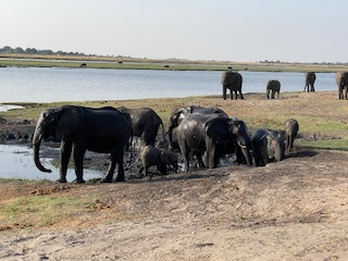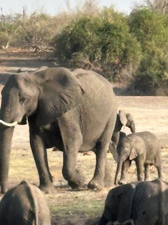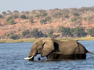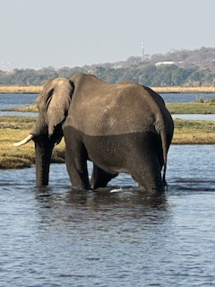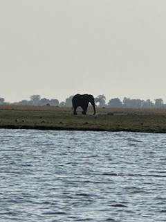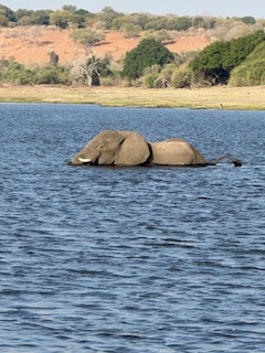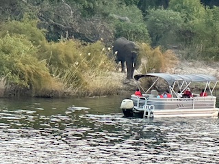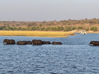 We said goodbye to our Zambian bus driver and squished into two small vans for the short ride to our hotel. Quick lunch and then onto a boat for our first view of the (now Chobe River) and Chobe National Park. Not to be outdone by all the other international conflicts about borders, Namibia and Botswana had to got the the International Court in the Netherlands to settle who owned what part of the channels on either side of the island whose name escapes me now. Botswana won for reasons I don’t remember either but now it’s all part of Chobe National Park Botswana.