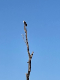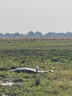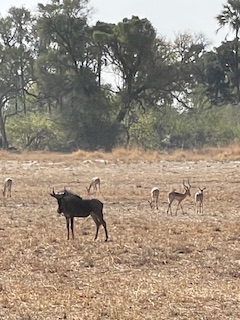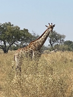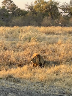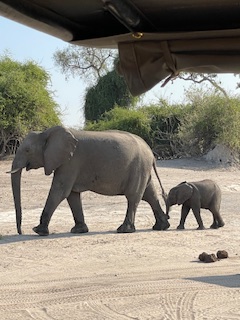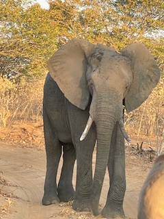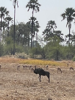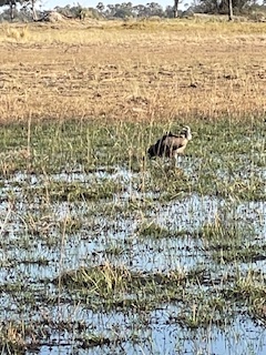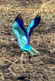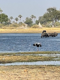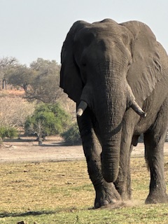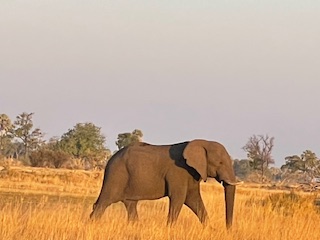 Since I am confused now, I will just post photos and try to make sense of the notes I took along the way. I was able to find a wonderful coloring book sized book with all the animals and birds found in the area so I may be able to identify the birds. Looking through photos between Al and me we actually got some decent shots of the birds. Here we go… this first fellow will be my forever memory of Okavango Delta. It was nearing sunset and we stopped for a snack. Like a movie, in the distance we saw this massive elephant slowly making his way towards us. I have a video and will try to upload it as well, but he was the hugest land animal I have ever seen, and we saw LOTS of elephants. He walked past us like royalty and took my breath away with his size and demeanor. I will never forget those five minutes. If you want me to send you the video via email or text just reach out to me, family and friends.