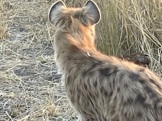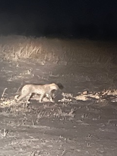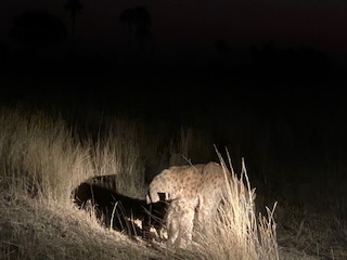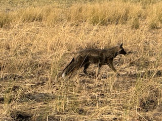 I am starting to lose track of what day is which and which safari trek is what. That was last night and after another sunset we did come back to camp with the guide using a heavy duty flashlight to scope out anything that might be running around after dark. It was mostly the usual suspects. Well, lah de dah, Mary, aren’t YOU getting complacent? Saw a striped jackal which I was surprised was not much bigger than a red fox. Who knew? A few more warthogs, some impalas.
