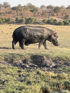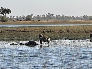 We saw cape buffalo, mostly males. Just an FYI, a cape buffalo will be happy to chase you up a tree, and will patiently wait there until you decided to come down. Do not mess with a cape buffalo. Saw lots of elephants. They are unbelieveably massive. The males hang out mostly by themselves, but the females, led by a matriarch who knows where to find food, hang out together. We were VERY fortunate to watch all of them cross the river. The huge male, followed by a juvenile male, was able to walk across as were the grown females, but the babes looked like they were swimming for dear life. When they started to finally walk up the bank on the island, one of the babes flopped itself back into the water like it was glad to be alive! A juvenile male had followed them across and was not thwarted by the grown female who took up the rear of the parade, but once on land again she shooed him away with a great elephant trumpet. Felt kinda sorry for him. He’s only a teenager after all….
