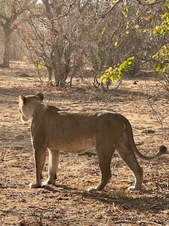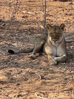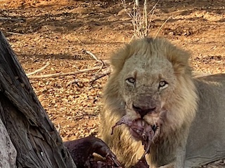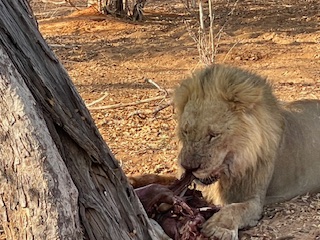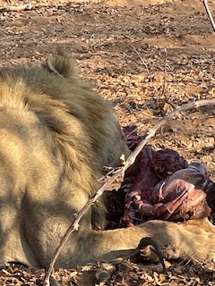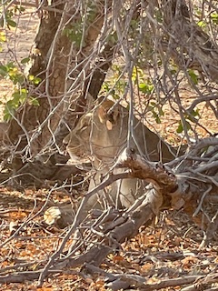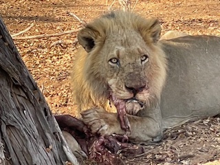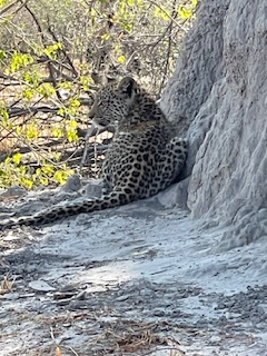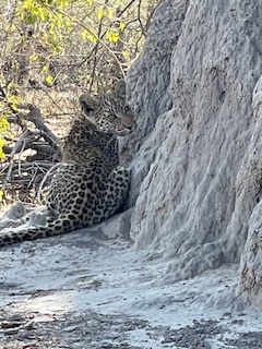 We landed on the gravel airstrip and were met by our driver and guide, Titus, and our guide and tracker Sianga. It took another hour to get to camp during which a leopard cub was spotted sitting in the shade of a termite tower and its tree. I did not expect to see as many animals as I’ve seen and certainly did not expect the feasting lions and a leopard. Will we see a cheetah? Who knows.