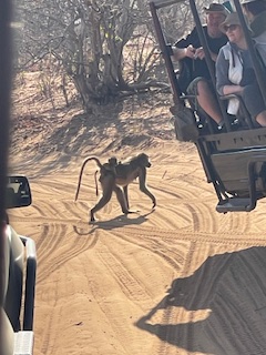 There are baboons everywhere. They are a lot more fun to see roaming around the national park than they are at the immigration crossing! The troops are large and riotous, big ol’ males and females with babes on their backs or bellies, the babes with big eyes and hanging on for dear life, looking like they wished they were back inside mom’s belly.
