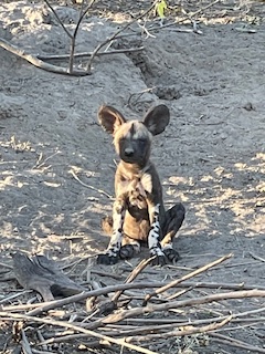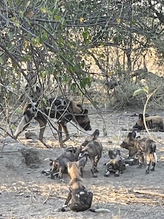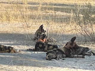 Another real treat of our morning safari was tracking wild dogs. They are sooooo beautiful,. dappled deep brown and black and white with white bushy tails and are endangered in Botswana. Why? They sometimes come in contact with domestic dogs who have rabies. They then contract it themselves, pass it on to the pups in the den when they regurgitate their food to feed them and wipe out the whole family. There are signs in the airports and elsewhere to report any sightings of wild dogs near humans so they can be relocated. Of course, any ranchers in surrounding areas also have their own way of dealing with the wild dogs, much like ranchers out west deal with wolves.