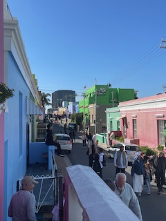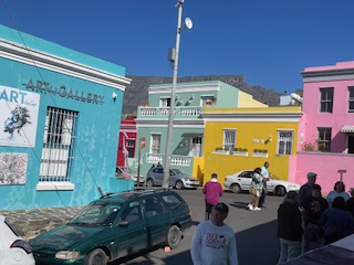 After leaving Okavanga Delta via flights to Maun and Johannesburg after final safari experience on the way to the airstrip, we arrived exhausted in Cape Town. The next morning everyone but me got up early for the city tour (ugh) and the Desmond Tutu Museum. I would have liked that but I had hit the wall. When they were dropped off for the traditional Gate One Tours local family home lunch, I was picked up by the bus driver and declared myself Queen Mary for this special treatment. Unlike most Gate One local experiences this was rather unexpected because it was a Muslim family who hosted us and the food was more like Morocco than what we thought we would have. Anyway, the neighborhood is mostly Muslim and since I didn’t go on the city tour I don’t know much about it except that the whole neighborhood was slave quarters a long time ago for a guy who lived on the hill. It is painted bright colors now and that’s all I know.