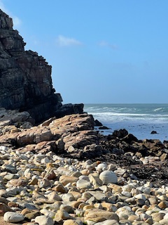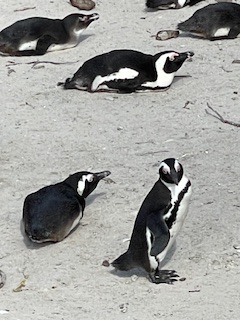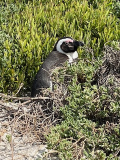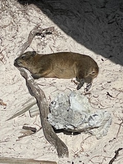 We then went on to see the African penguin colony. A fellow traveler pointed out another animal lounging in the sun. It was about the size of an otter but looked very rat-like. Turns out Belinda told me it was a hydrax and – get ready for this and you can look it up, I certainly did- it’s closest relative is an ELEPHANT! Crazy. She also told us it is an animal that can look directly at the sun without damaging its eyes and it loves to lounge in the sun. As you can see in the photo that was exactly what it was doing!
