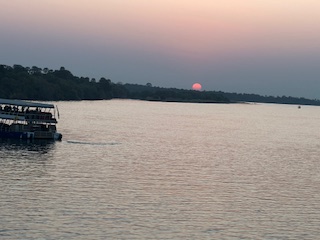 Fifteen minutes to shower and refresh then onto a boat on the great Zambezi River for a sunset cruise where we would maybe see hippos, crocs, elephants, zebras and giraffes. Saw all but the giraffes which were spotted by the guide but were really far away and scooted into the bush before I could find my favorite animal (other than boxer dogs, of course).