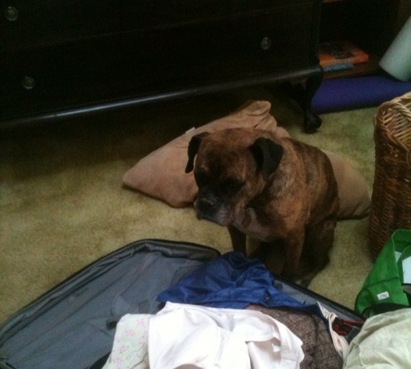 This dog is so needy. A week ago he was sitting next to the suitcase, looking as if he knew he was headed back to a rescue shelter, that we just didn’t love him anymore. I have been home less than twenty four hours and he is following me around like Mary Had a Little Dog and when I sat down with my laptop on the couch he got up here and is snuggled so tight up against me I can’t move. He’s a 55 pound boxer, dudes.
