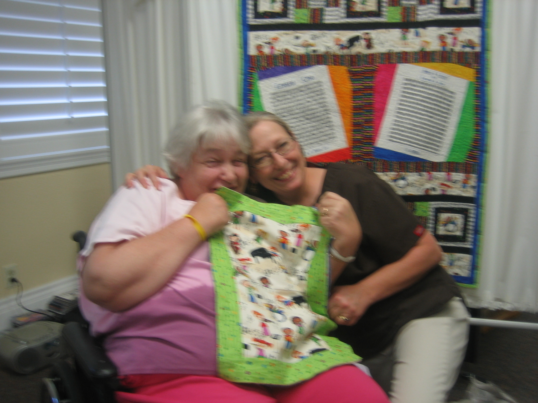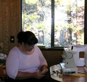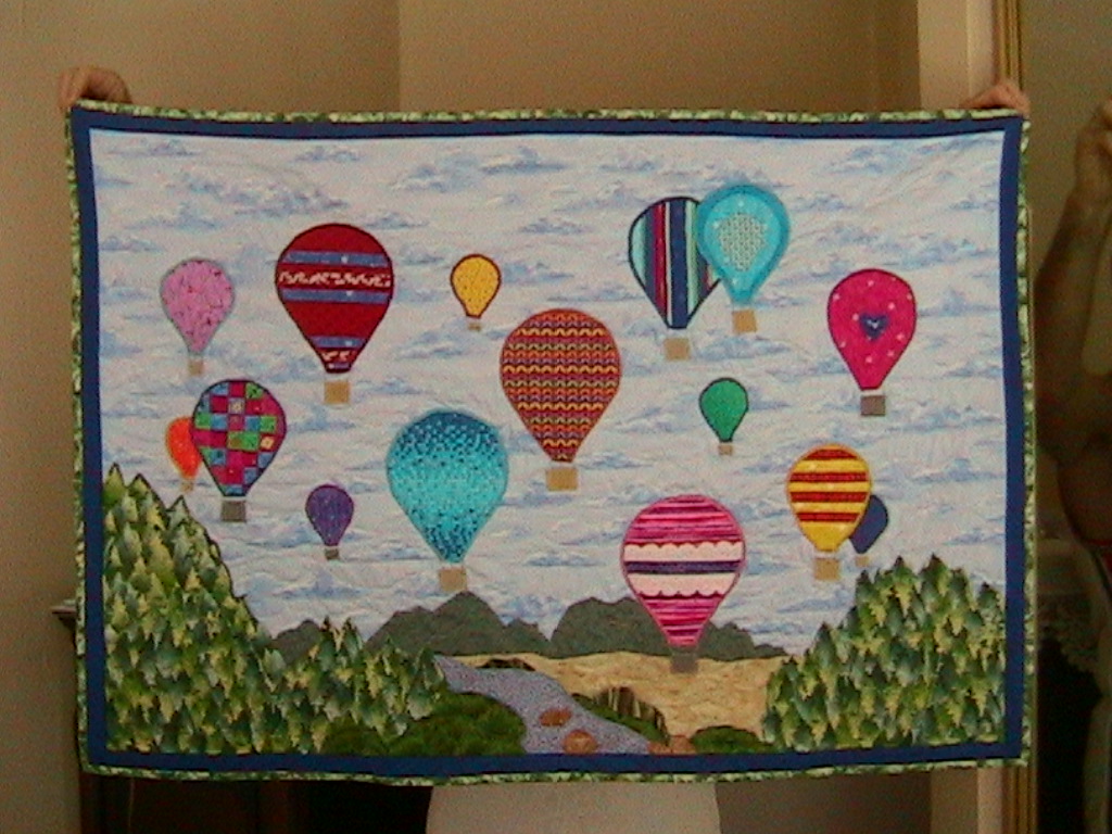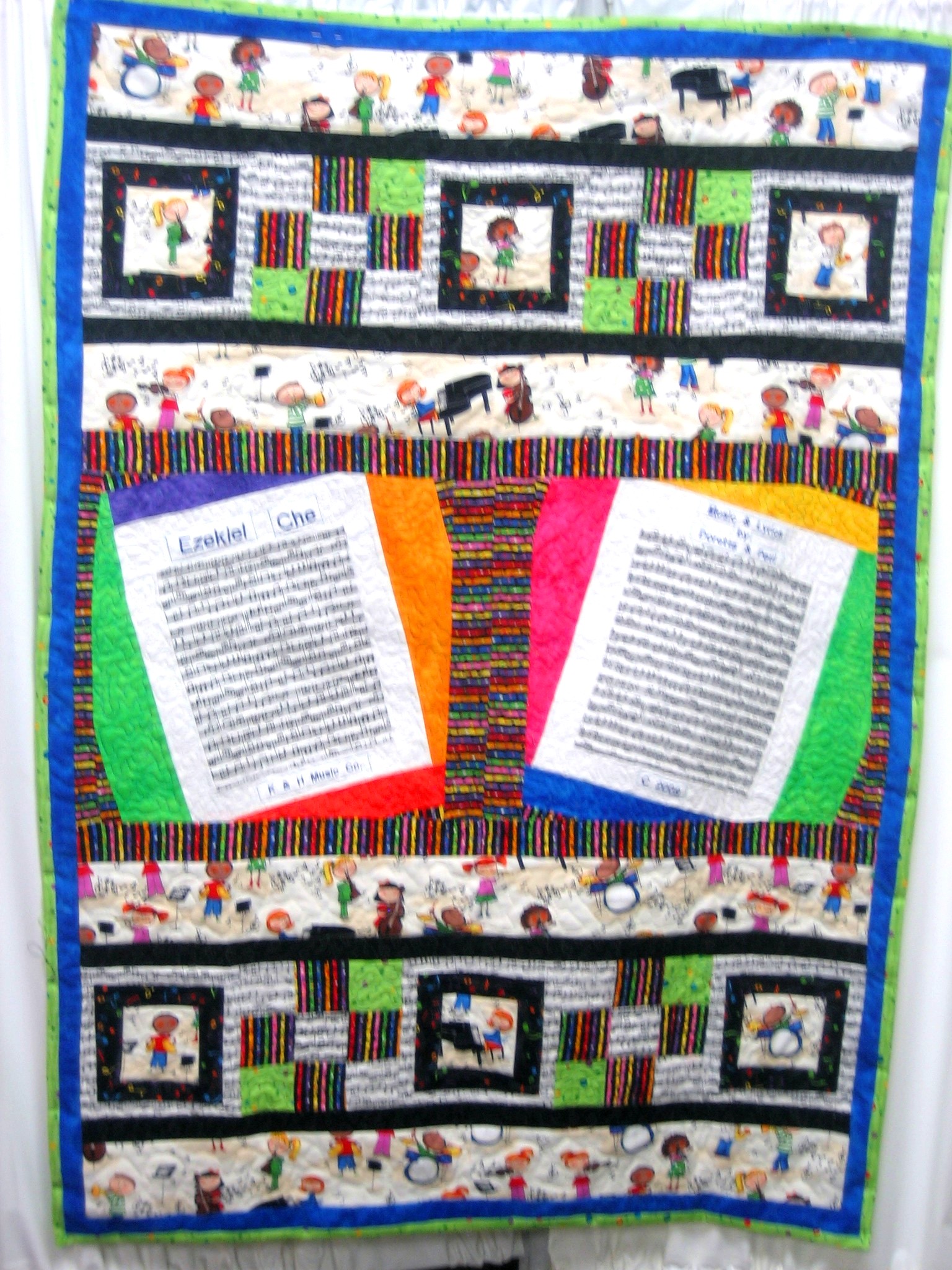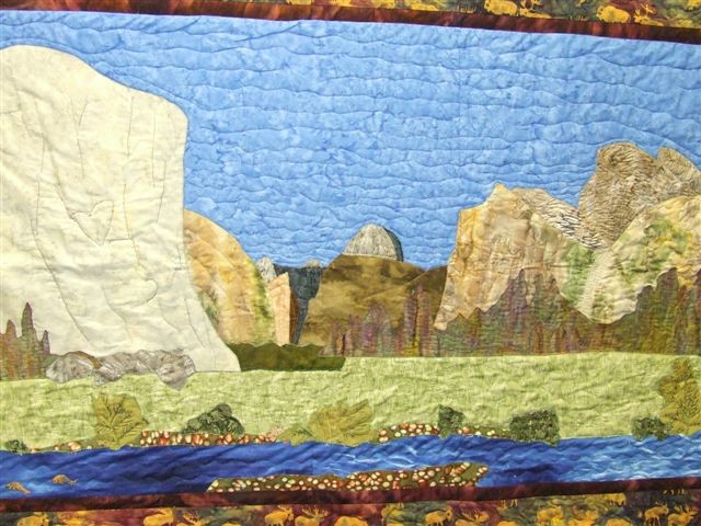 Although we make block quilts at times, Terri and I like to let our creative imaginations run amok and make what we call “art quilts.” As an example, Terri has made a quilt of Yosemite Valley for her son, complete with rock climbing routes up El Capitan stitched into it. One of my favorites that I made was a music-themed baby quilt. I made it for a resident at a nursing home where I worked. Her daughter was having a baby and the parents were both musicians. So I designed a quilt with the cutest little cartoon kids playing all kinds of instruments (my favorite was the little drummer – he was GROOVIN’) and all kinds of wonderful musical fabric; the middle of the quilt was two “pages” of music notation, and the title of the “song” was the name of the baby-to-be; music and lyrics by Doreen and Paul; copyright 2009. You get the idea. It just turned out beautifully and my friend was delighted, as was her daughter.