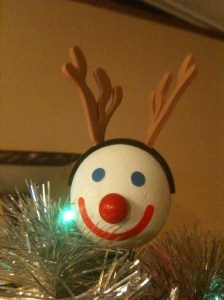 Update: I really have been sad about this tonight. I am beginning to realize what else got lost but it was the bear that really hurt. When I came into the room the moose just wasn’t cuttin’ it – for one thing, it didn’t have a smile. So. I ended up putting Mr. Jack in the Box (with his reindeer hat) on the tree top. For you East Coasters, you don’t have Jack in the Box but it’s a hamburger chain. For many years they would give out promotional car antenna balls of Mr. JITB – with baseball hats of local teams, I have one from the turn of the century with a New Year’s Eve hat. Cars don’t have antennas much anymore so I guess they quit doing it. Anyhoo, I put him on top and I must say he is making me feel much better with his happy smile. I’m such a fruitcake…speaking of which, the fruitcake my mother always sends arrived today – made by those awesome monks in Gethsemane, Kentucky. And now, the new Christmas tree topper in the Sondag home: Mr. Jack in the Box (Reindeer Dude) – awaits Baby Jesus…