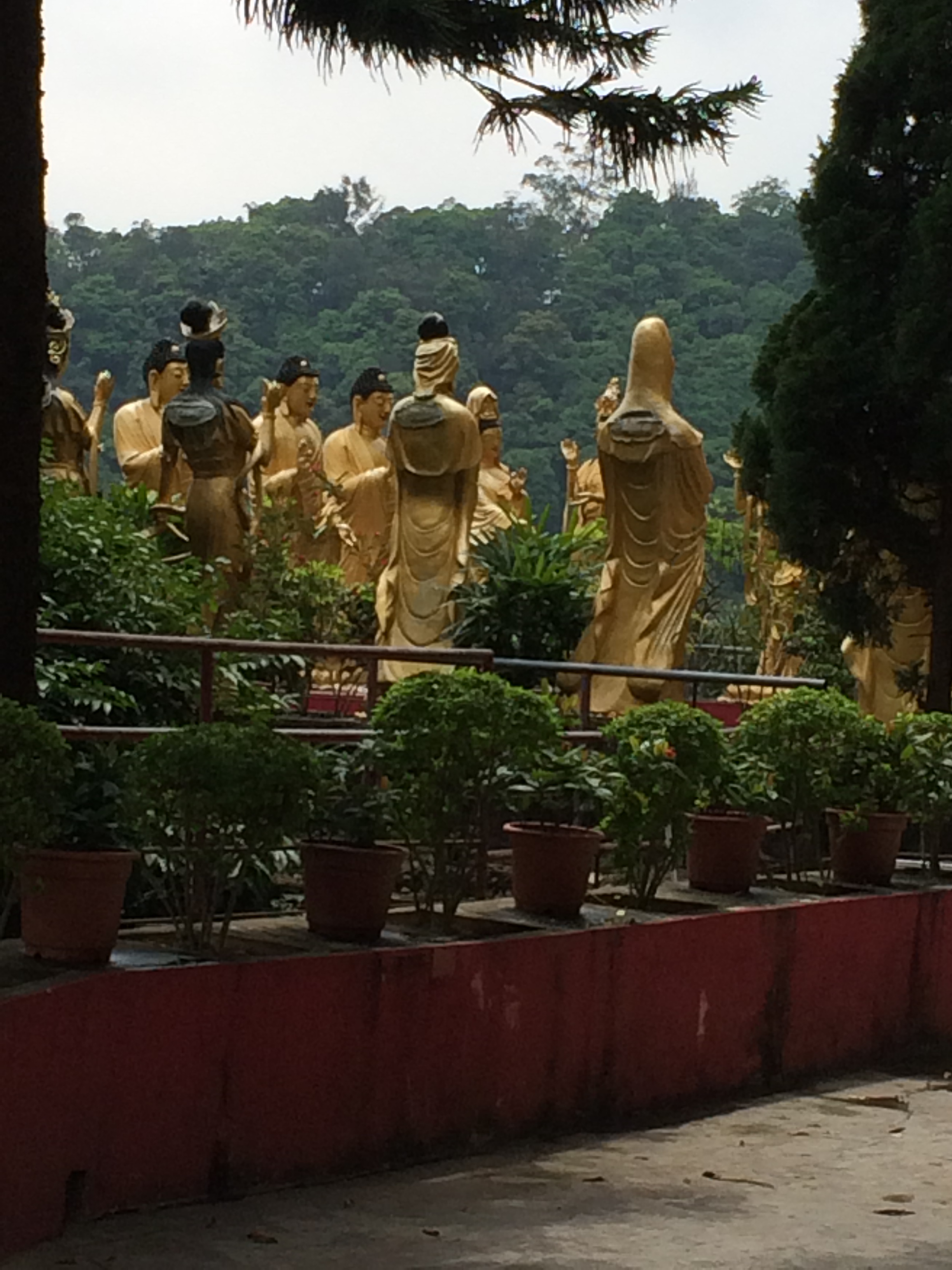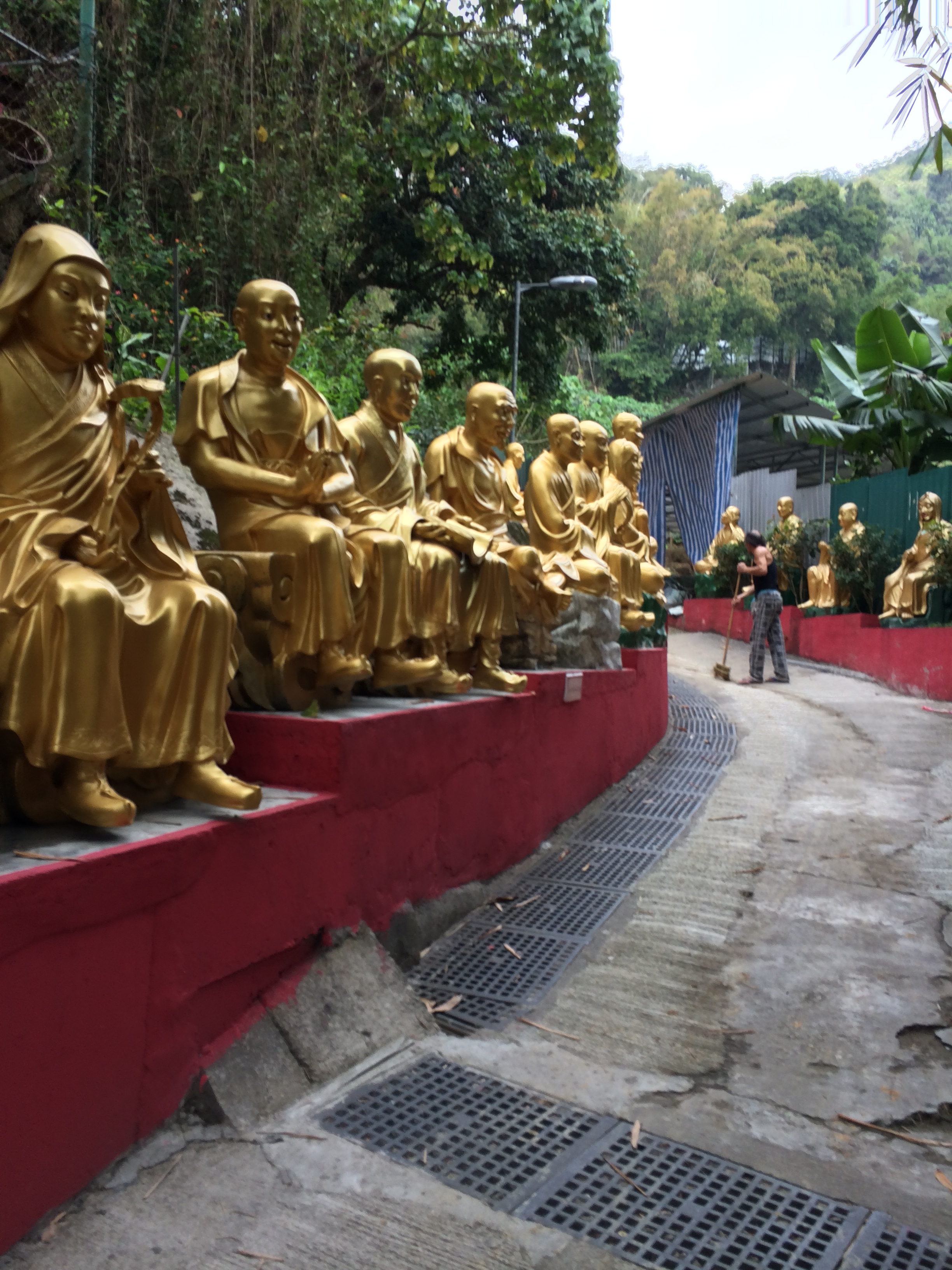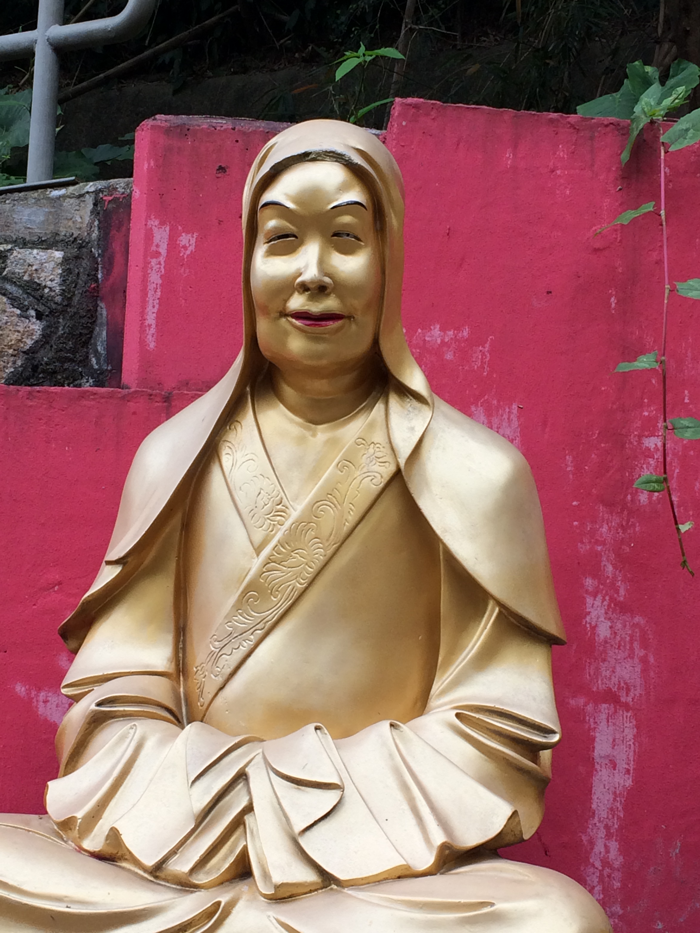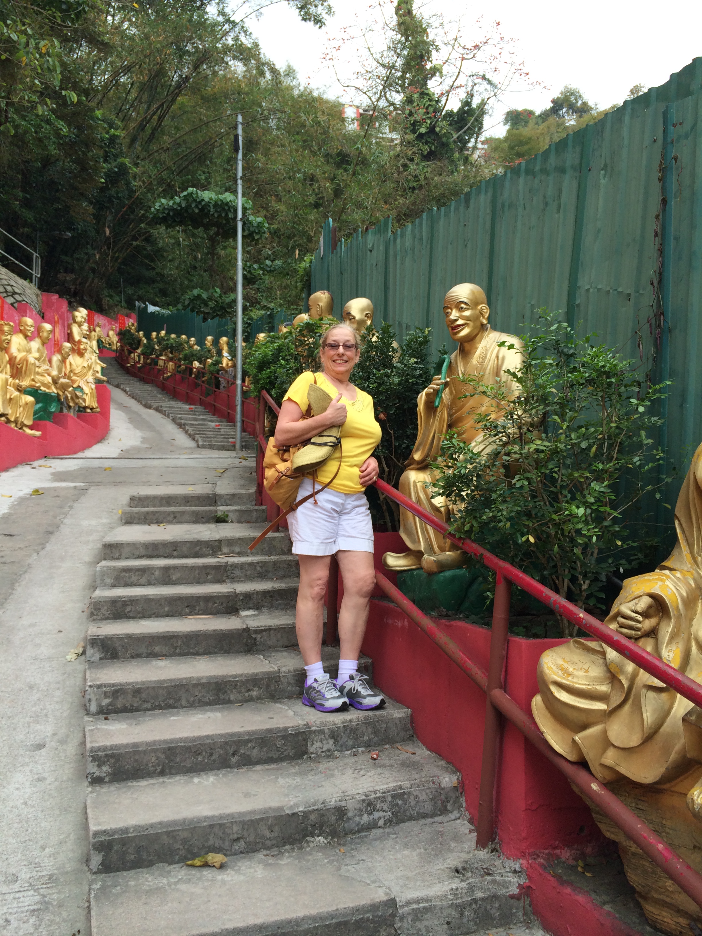 One of my choices the day before had been Ten Thousand Buddhas Monastery (Man Fat Tsz). It is kind of an out of of the way place and is not widely publicized by the tourist industry in Hong Kong because some of the structures were not considered safe by the government and so it was not encouraged that tourist signs be put up directing how to get there. Just my kind of place! When we arrived it appeared that some work was being done to rectify that situation – some of the slopes had retaining walls and signs that said they were ok by the government agency involved. The pagoda, which is advertised online as being accessible to walk up the stairs inside to the tip top was closed and being worked on.