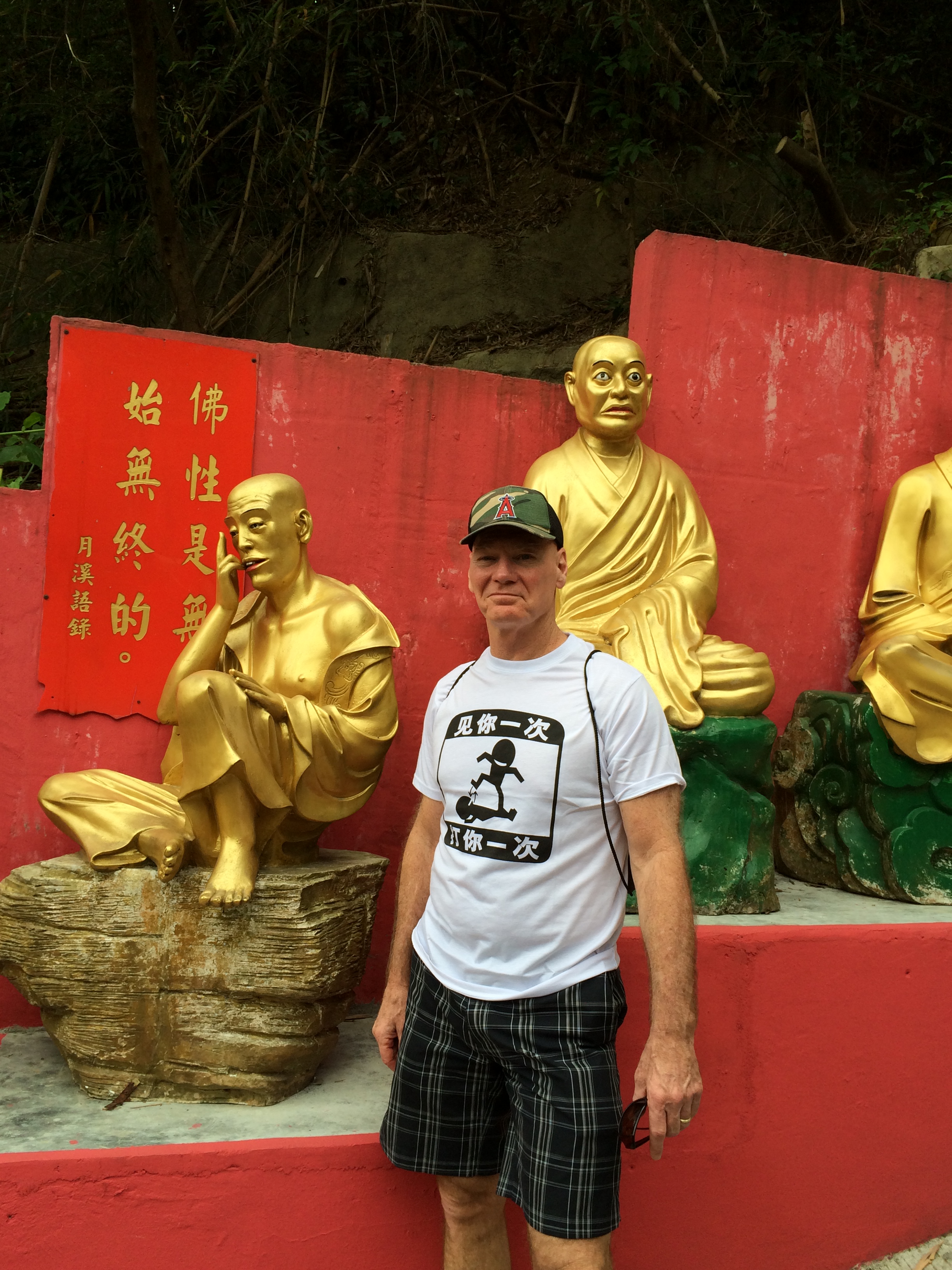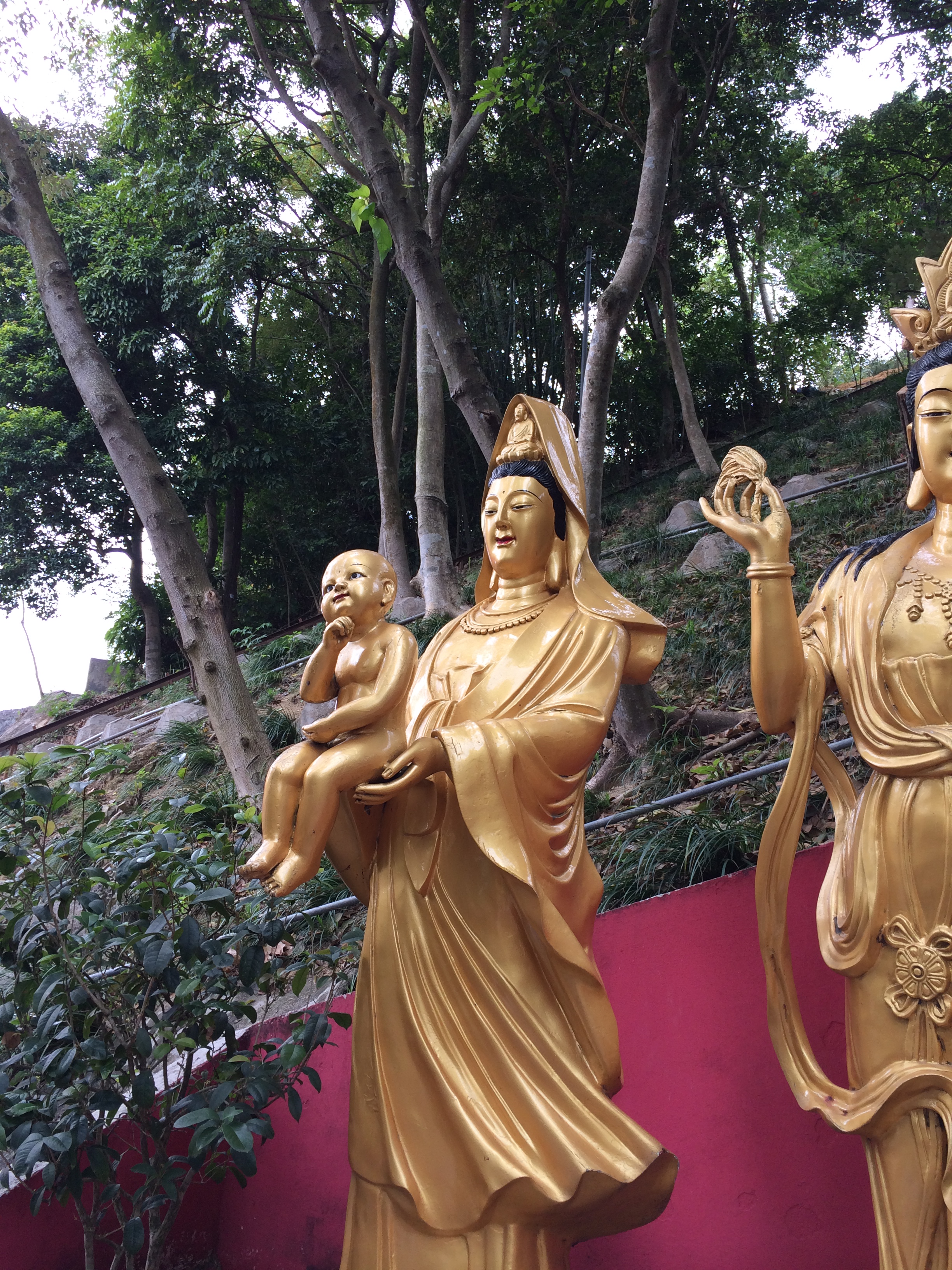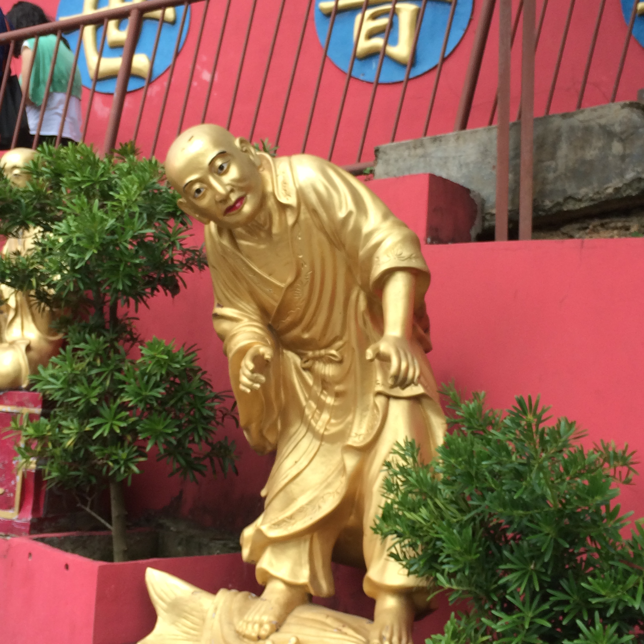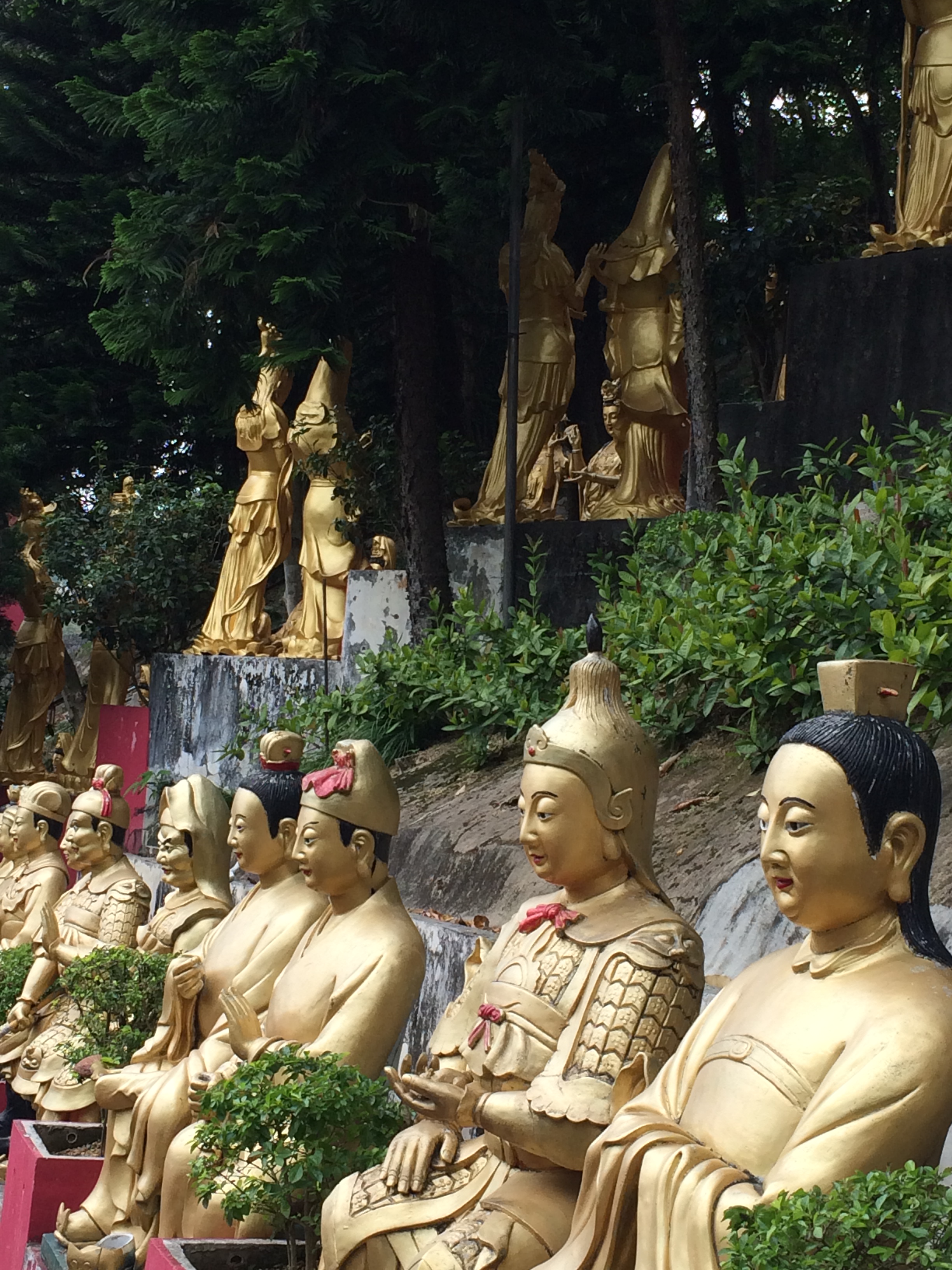 One of my choices the day before had been Ten Thousand Buddhas Monastery (Man Fat Tsz). It is kind of an out of of the way place and is not widely publicized by the tourist industry in Hong Kong because some of the structures were not considered safe by the government and so it was not encouraged that tourist signs be put up directing how to get there. Just my kind of place! When we arrived it appeared that some work was being done to rectify that situation – some of the slopes had retaining walls and signs that said they were ok by the government agency involved. The pagoda, which is advertised online as being accessible to walk up the stairs inside to the tip top was closed and being worked on.