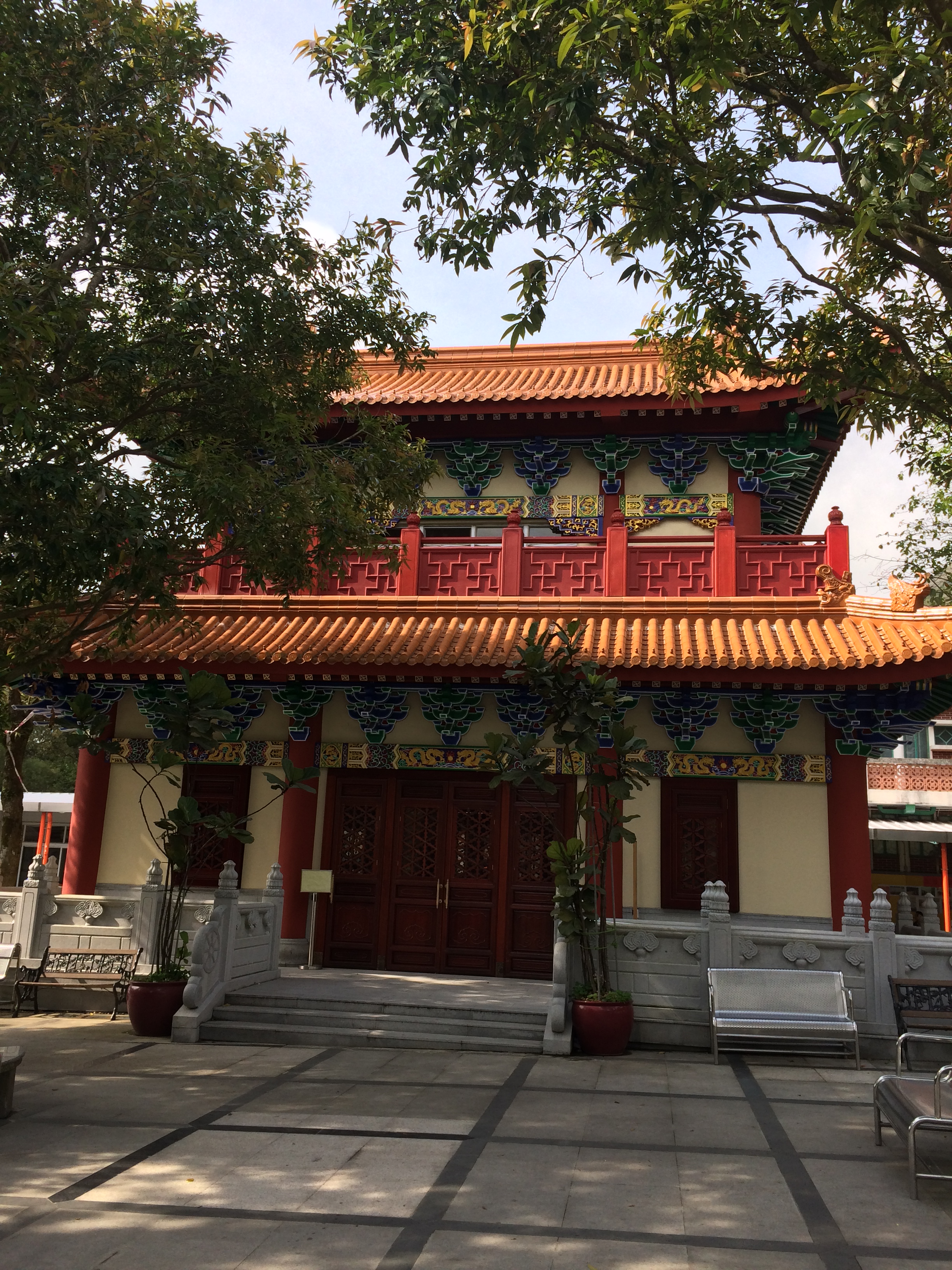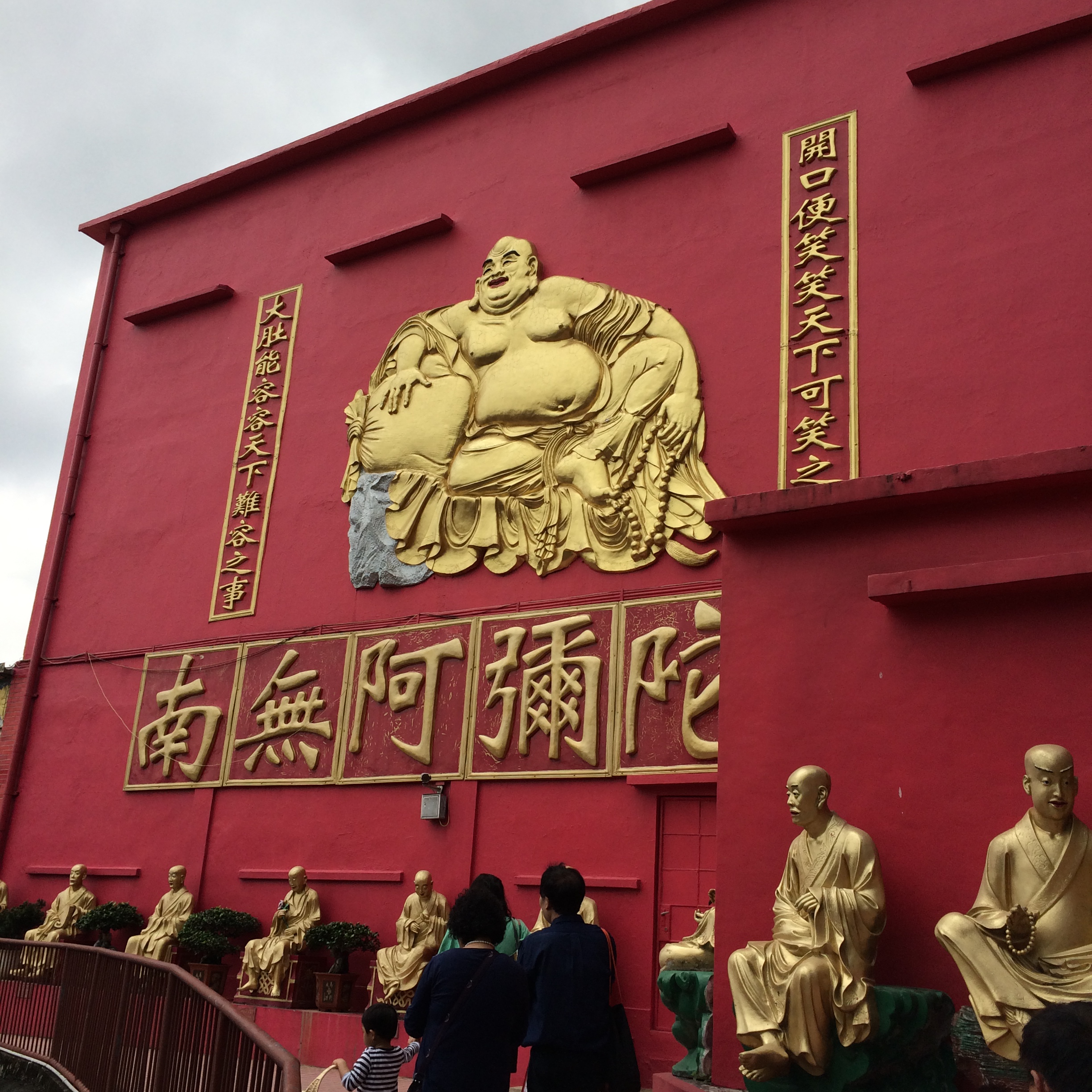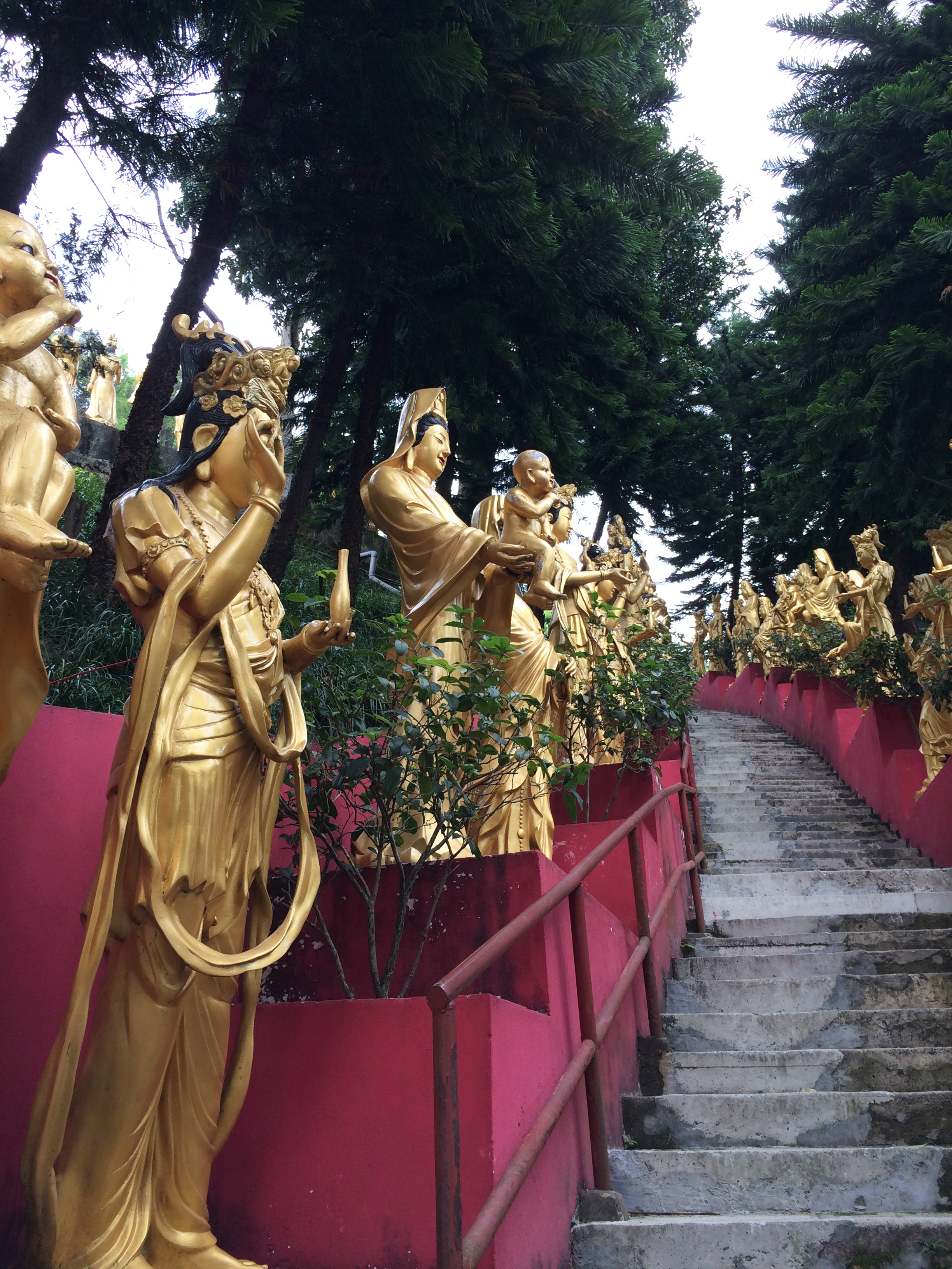 “The preserved corpse of the monastery’s founder, Reverend Yuet Kai (The Diamond Indestructible Body of Yuexi) is displayed in a glass case in front of the main altar.The monastery was substantially redecorated in 1968, some of the pavilions were rebuilt and all the statues were repainted or coated with pure gold. Severe flooding and landslides in 1997 caused major damage to the monstery and some buildings were destroyed. The monastery was closed to the public for two and a half years for reconstruction which still continues today at the monastery’s upper level. The monastery is built over two levels on a bamboo forest hillside overlooking Sha Tin and occupies an area of over eight hectares. It has five temples, four pavilions, one verandah and a pagoda and is reached by a steep concrete path with 431 steps. The path is lined on either side with 500 life-size gilded Arhan statues.”