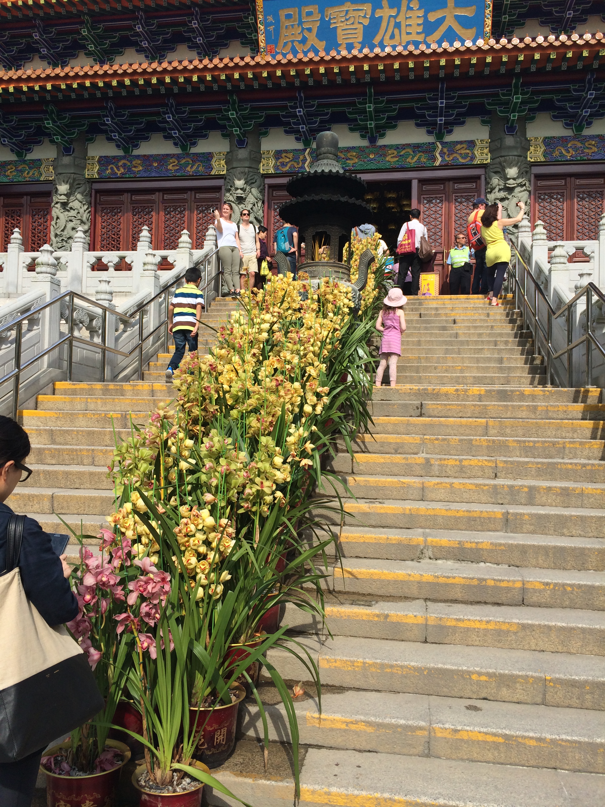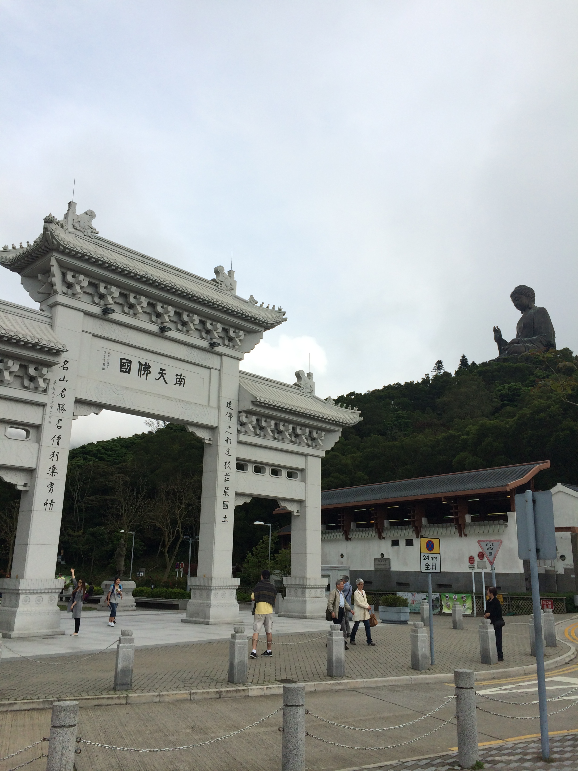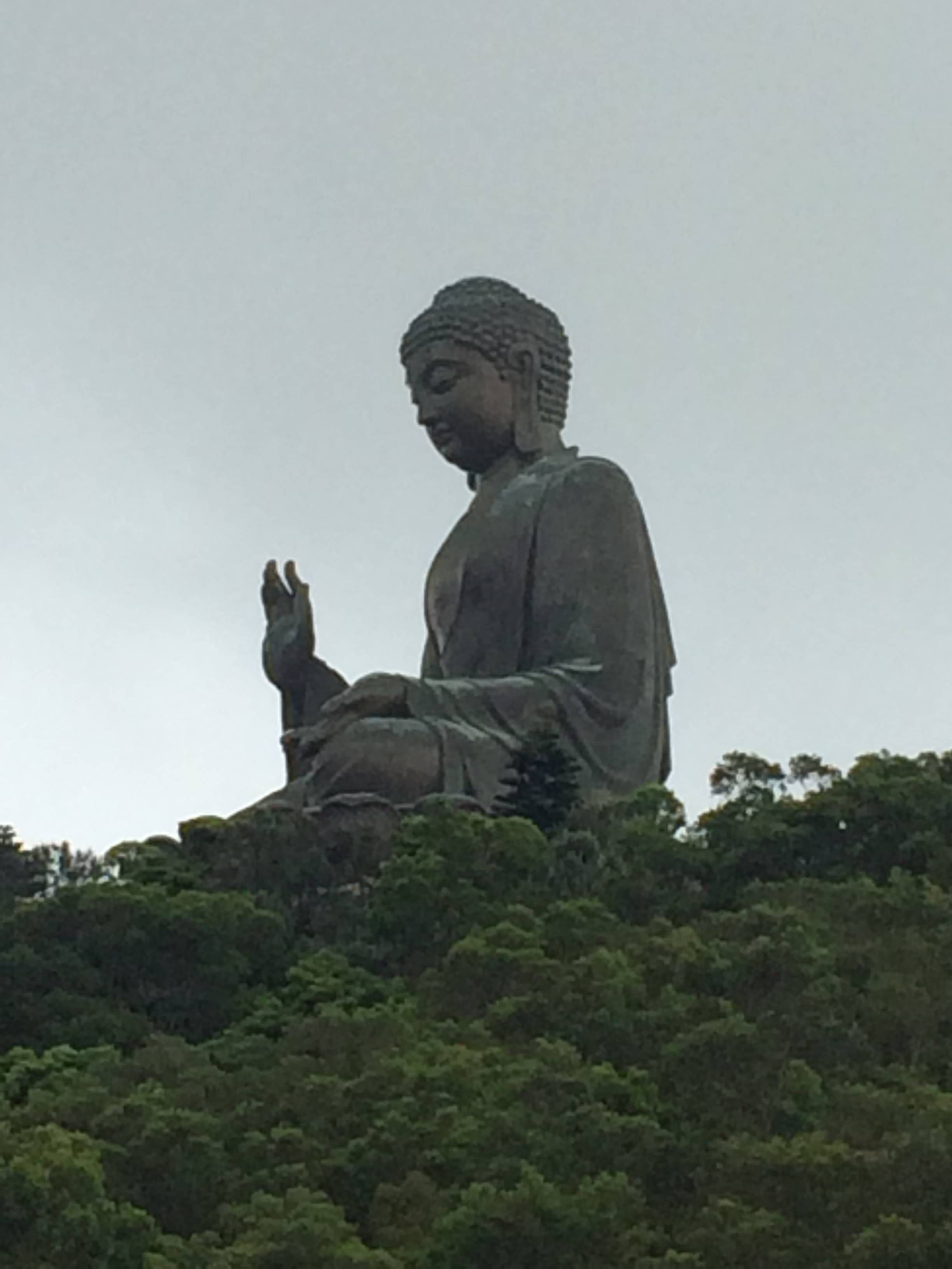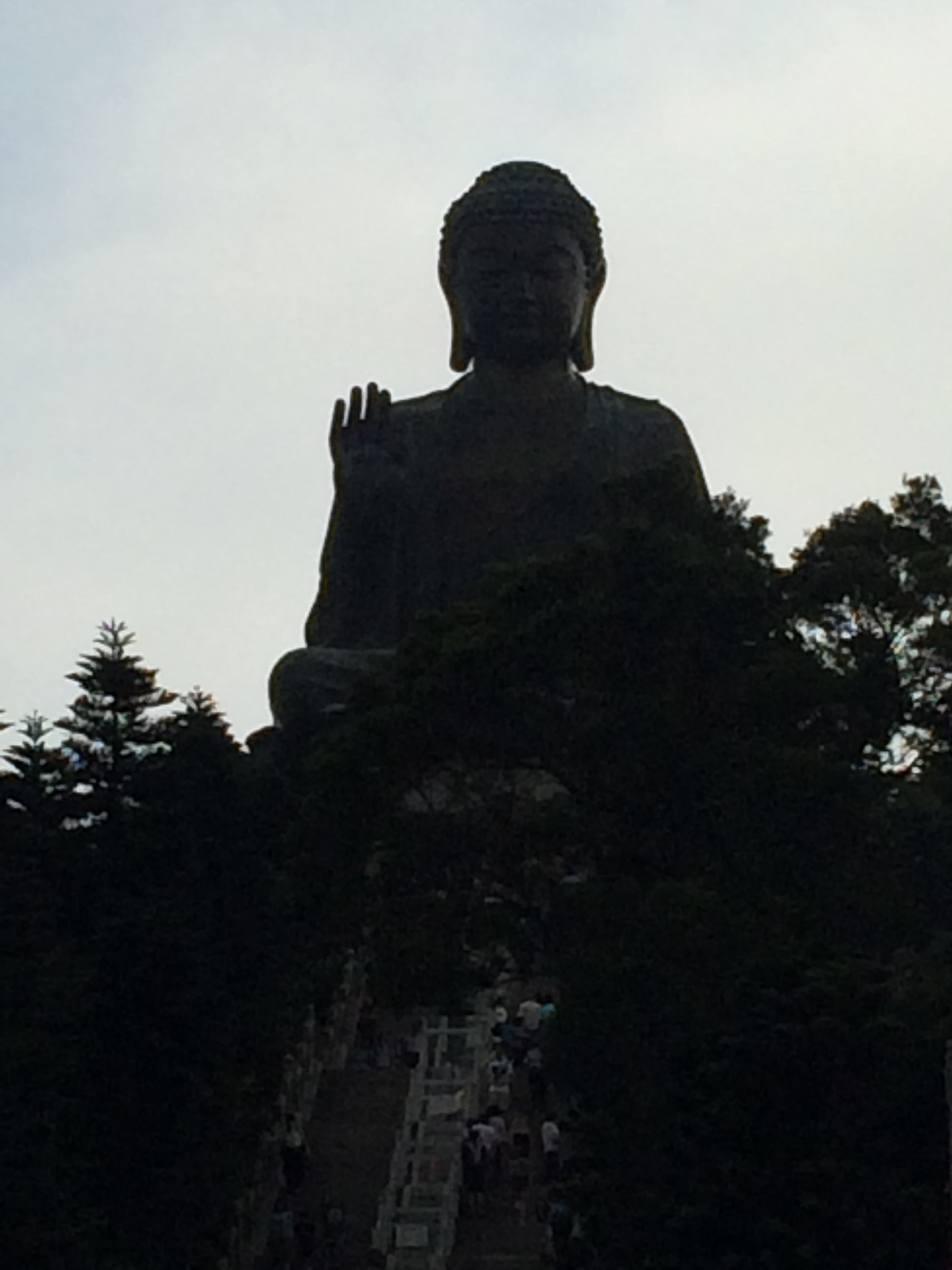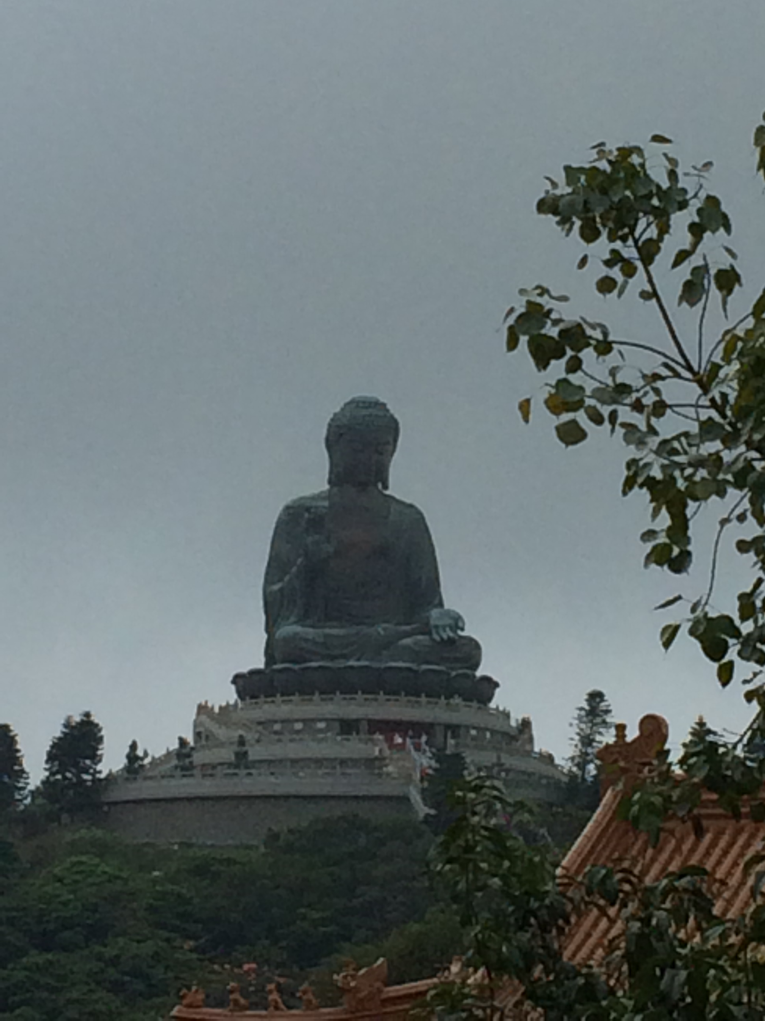We were just finishing up, about Buddha’d out and ready to head back down the stairs when we heard from the other three that they were headed to see the Tian Tan Big Buddha at the Po Lin Monastery. We took a very long and picturesque gondola ride to get to the base, and of course are greeted by shops before you get near the entrance to the Buddha and the Monastery. I am sorry to say I was not able to walk up and down any more steps, my knees have had enough. But it was impressive – maybe next time. I did meander the grounds and took a peek inside the Monastery Temple. Services were being held and so we were not admitted entrance at all and a guard stood outside to shush the visitors hanging outside the door. I did record the sound of the monks chanting which was nice (you need to turn your sound up pretty high) (I have no idea what that shoehorn thing is sticking into photo):