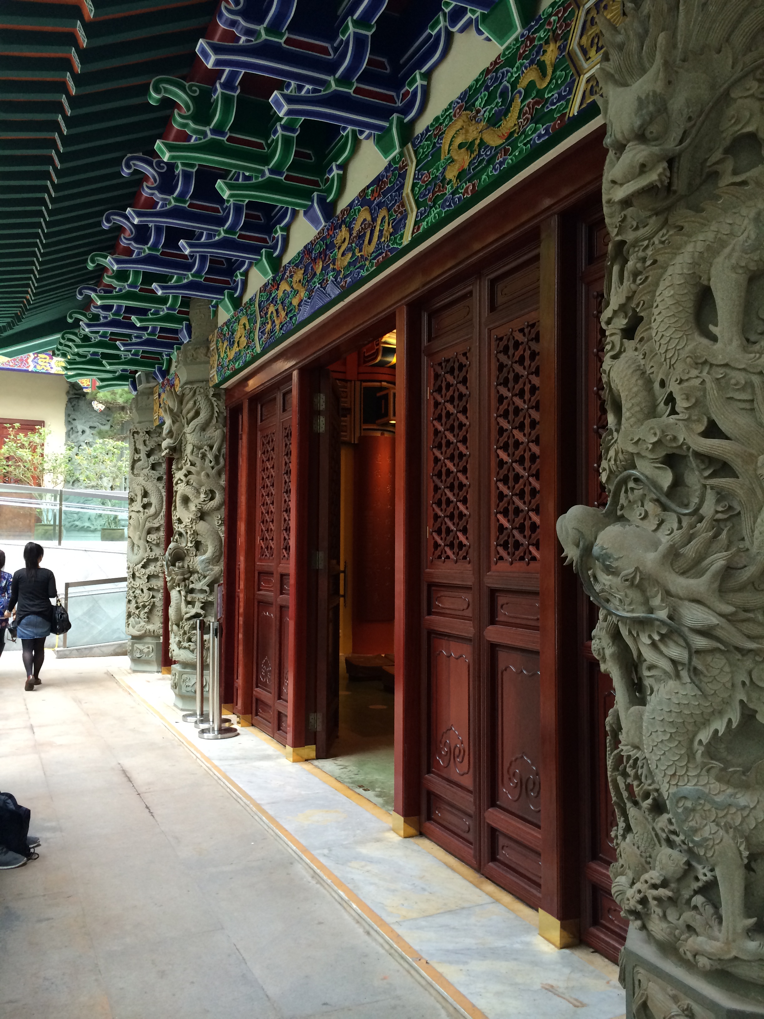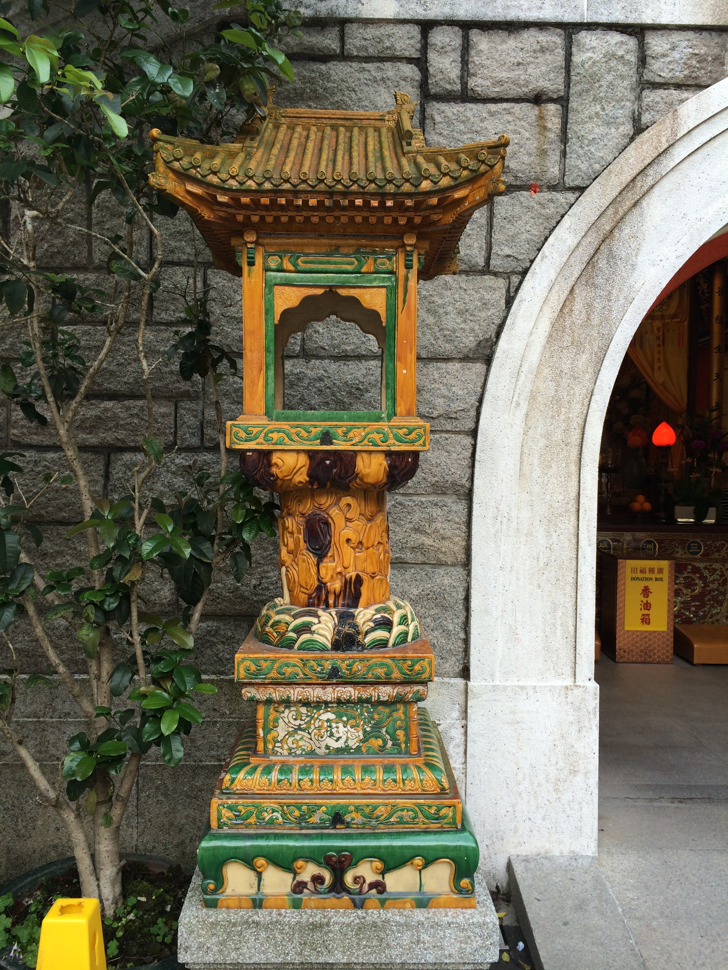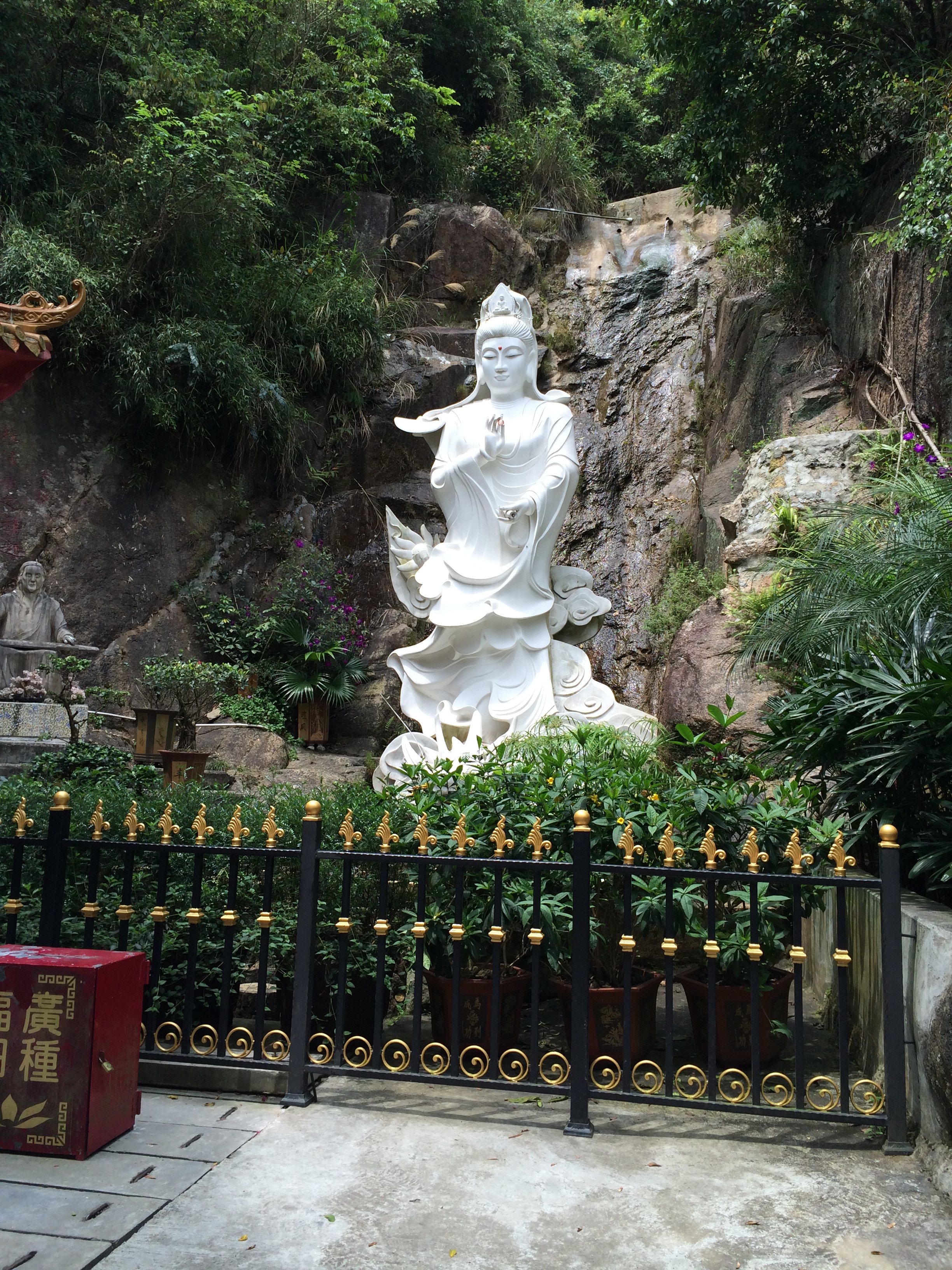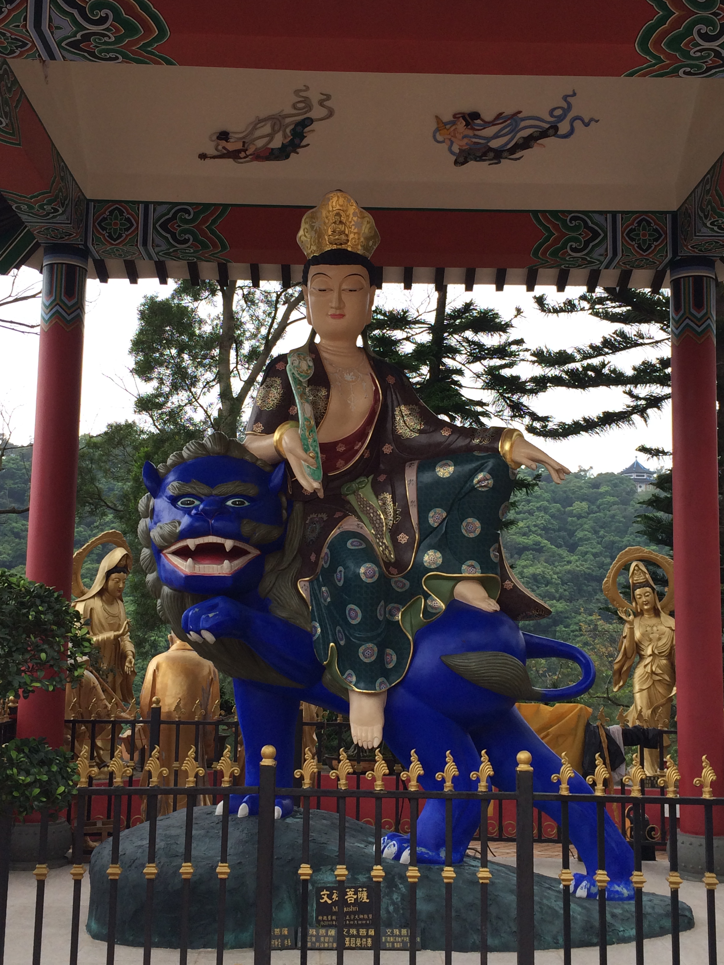 We were just finishing up, about Buddha’d out and ready to head back down the stairs when we heard from the other three that they were headed to see the Tian Tan Big Buddha at the Po Lin Monastery. We took a very long and picturesque gondola ride to get to the base, and of course are greeted by shops before you get near the entrance to the Buddha and the Monastery. I am sorry to say I was not able to walk up and down any more steps, my knees have had enough. But it was impressive – maybe next time. I did meander the grounds and took a peek inside the Monastery Temple. Services were being held and so we were not admitted entrance at all and a guard stood outside to shush the visitors hanging outside the door. I did record the sound of the monks chanting which was nice (you need to turn your sound up pretty high) (I have no idea what that shoehorn thing is sticking into photo):