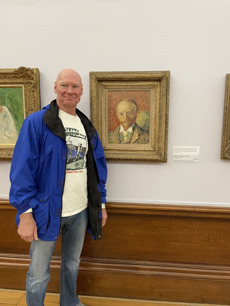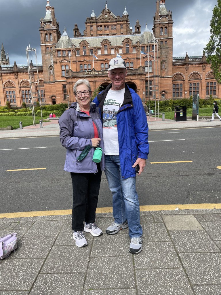 Travel tip in the UK. When you know which direction your bus will be heading, and you want to board that bus, it will be arriving on the LEFT side of the street, not the right. Just as we realized this after standing at the wrong bus stop for 10 minutes (the nice local man who took our photo in front of the Kelvingrove should have given us a clue that it wasn’t a Hop On/Hop Off stop) and walking a block or two we saw our bus coming. It would pick us up just across the four lane street. We stood there looking, I suppose, like the stupid tourist we are, and a lady with a little dog said “just go!” meaning jaywalk. Crossing at street corner in UK is daunting enough let alone mid-block. No worries “I’ll stop the traffic for you…” and off she went with her little dog and after a few cars passed she walked right in front of another and next thing you know we are catching our bus. We waved her our thanks and will never forget her and her little dog. She wasn’t a young woman either!