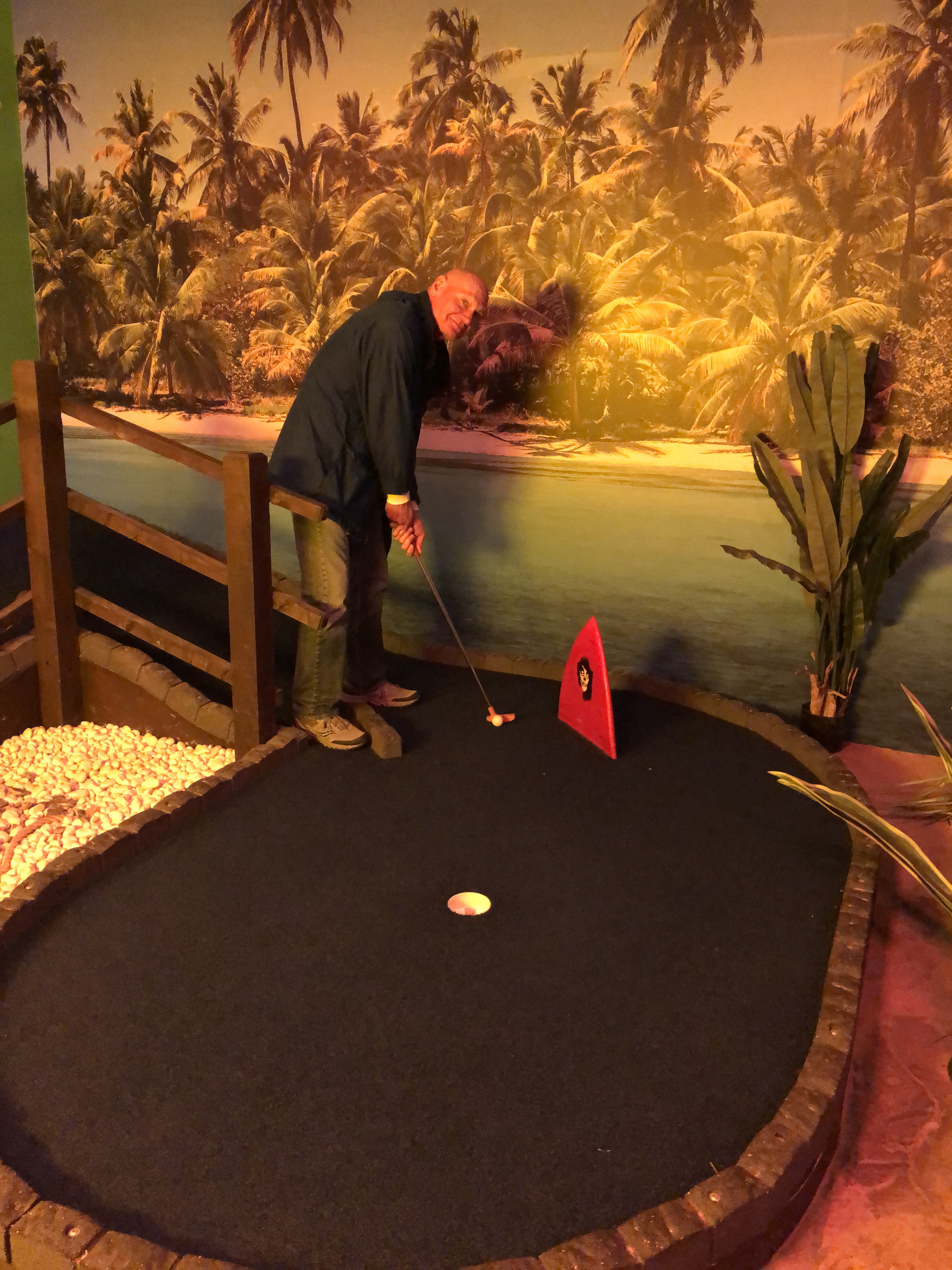 Last stop, Mini Golf. The young woman, college aged, at the counter talked SO FAST. Al tends to just stand there hoping he’ll understand through osmosis, but I just smile and laugh and say “oh honey you are talking SO FAST”! She broke into a huge smile and slowed down for us. What she was trying to tell us was we could do 16 holes upstairs or 18 downstairs in the day glow but that was really busy right now. So we opted for upstairs. When we took a look at downstairs afterwards we wished we had gone down there but at 22:00 hrs it was too late to start (with the sun setting at 9:45 it’s easy to get disoriented).
