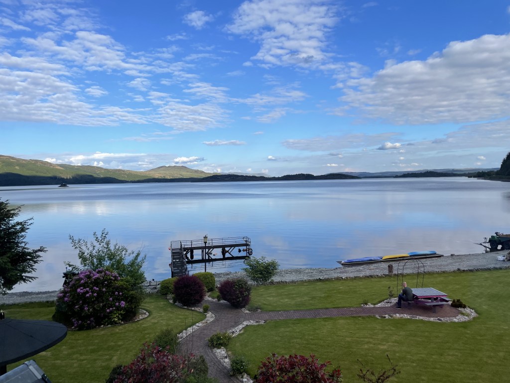 We woke up to a beautiful morning on Loch Lomond. I haven’t mentioned the weather has been just fine. We compare it to winter in San Francisco which is tolerable at worst and there has been very little rain. We have the occasional cloudburst but generally gorgeous clouds like we never see in SoCal and warming sun at regular intervals.