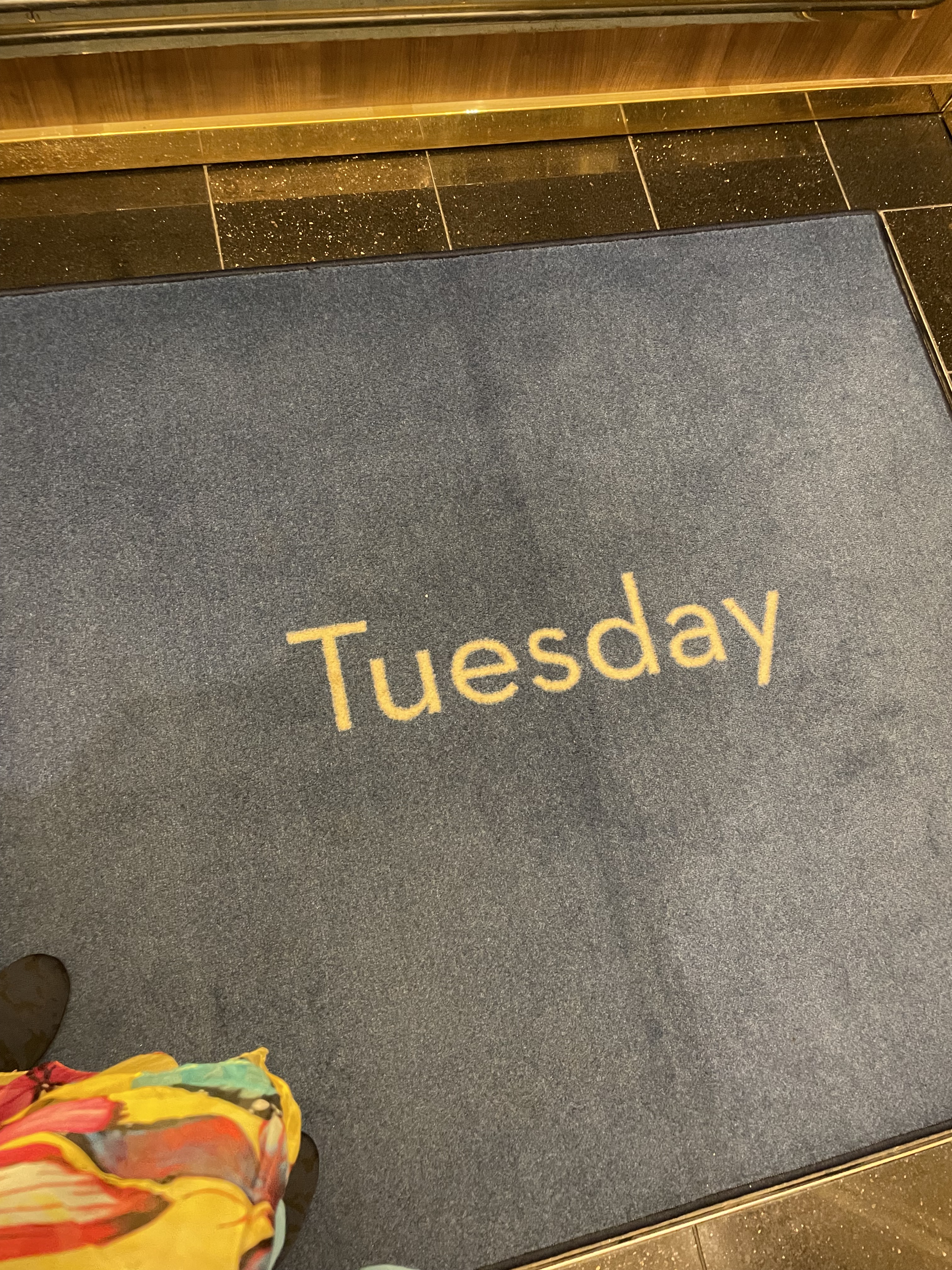 Bopped down to dinner about 8 p.m. A word about cruise life. Every cruise company is a little bit different and excels in some ways and lacking in others. Holland America has GREAT food. The old stereotype of buffet 24/7 is non-existent on all ships now and has been for some time. Most ships do have food of some sort available but the “midnight buffet” is a thing of the past. The portions are reasonable (they’ve gotten more “reasonable” lately it seems) which is fine with me. You can order a whole second plate if you want. The bread on every ship I’ve been on is my Achille’s Heel (see what I did there?) and I try to stay away from it. It’s always a goal to not come home with an extra fifteen pounds and it’s been easier to do the older I get. Holland America makes it even easier by having set times when you can access food. The other thing Holland America does that I LOVE is that every morning when you step on the elevator, the rug tells you what day it is. This is more helpful than you might think! And yes, I’ve been taking the elevator. 10K steps is easy to get on a trip like this and 20K is often the norm.