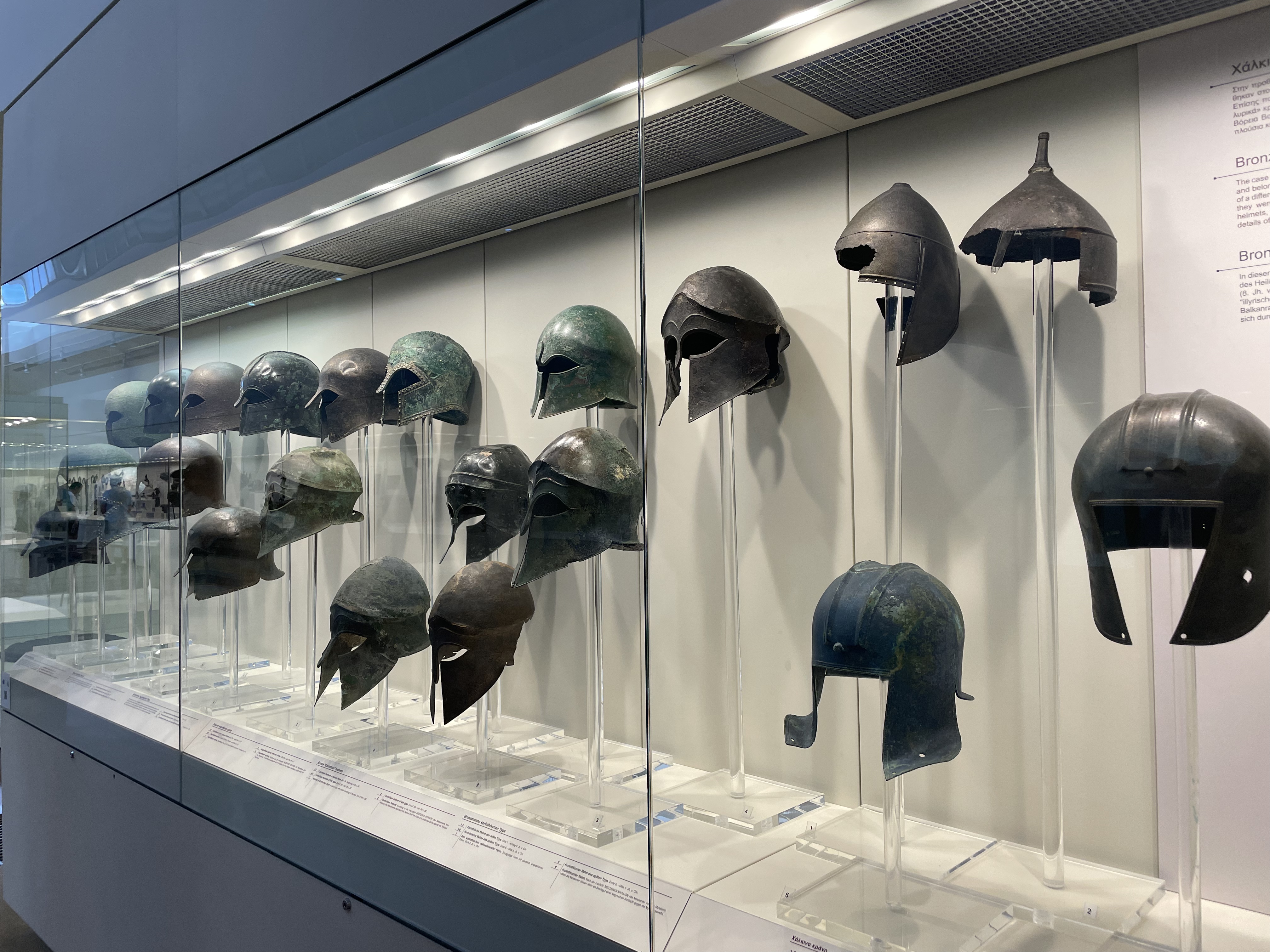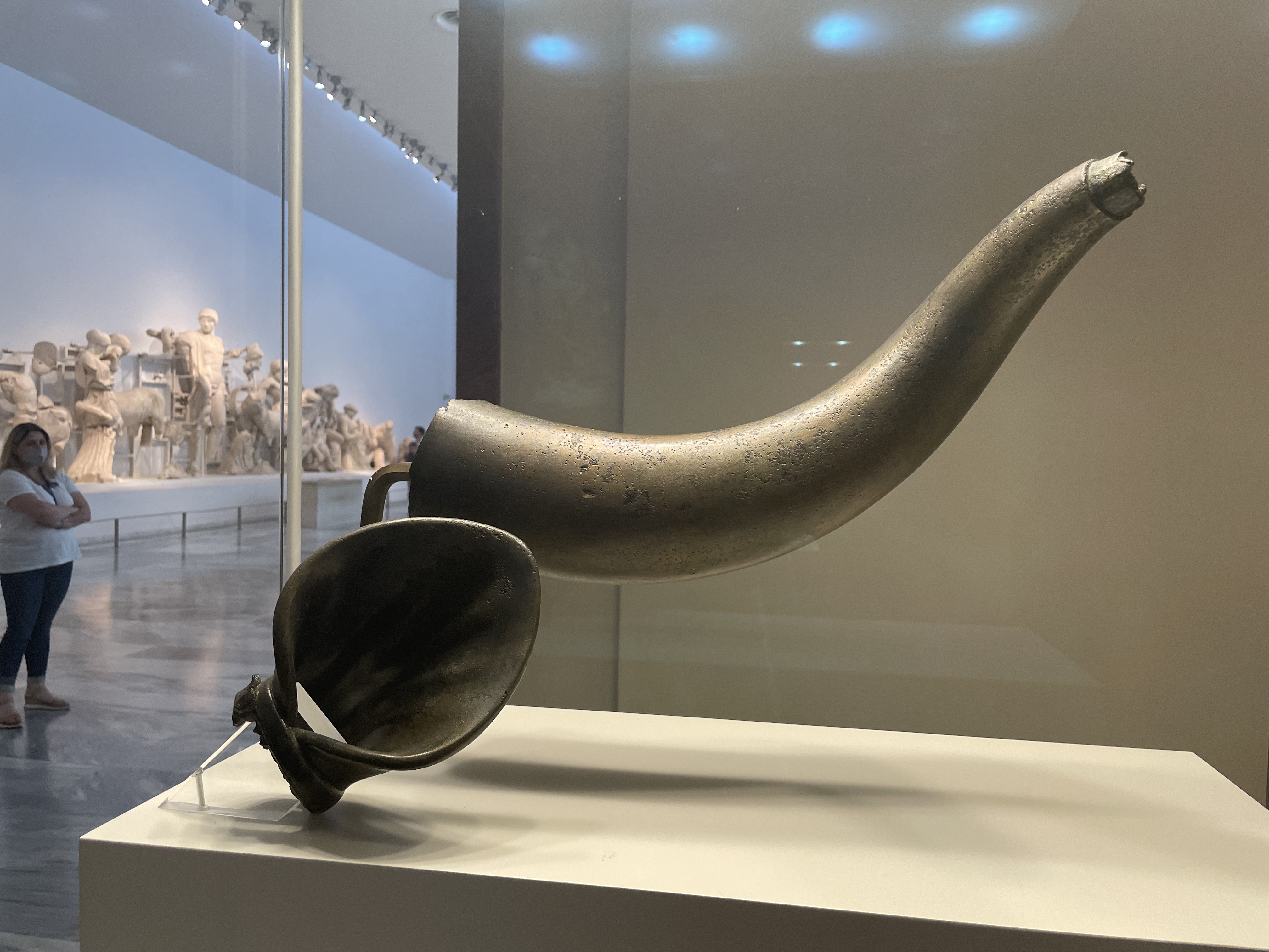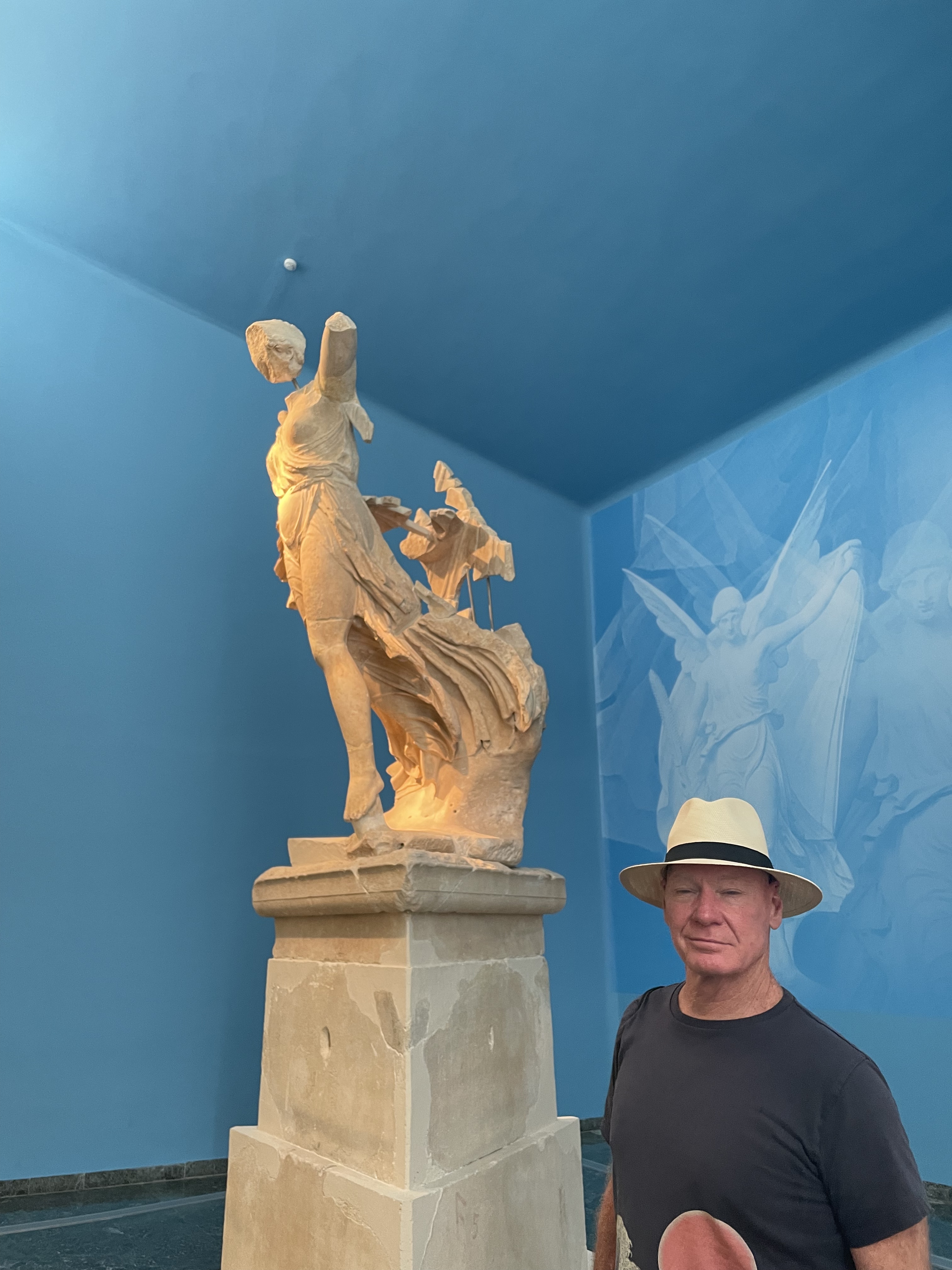 The museum houses what has been found at the site thus far dating back to the prehistoric 8th century BC through 5th century AD. Lots of bronze – trinkets, votives, statuettes, helmets, shields, weapons, vases, tripod cauldrons, glass vases. Originally glass was made by casting and other methods that I don’t remember. Blowing glass only came around later and that’s when glass became more accessible for us peons. Terra cotta everything – building decorations, pots, ewers. Most of the little trinkets were left by visitors/worshippers and are the size of those little green army men kids play with except they are brass. Statue of Nike, (incomplete, no wings), lots of headless statues. I wanted to know why they don’t have heads and a quick Google search reveals one reason may be that some Roman emperor wanted all the statues and was going to replace the heads with his own. What IS it with these megalomaniacs????? I guess there’s a grand tradition. He died anyway so they stayed there. I should note that a lot of damages are attributed to earthquakes over the centuries.