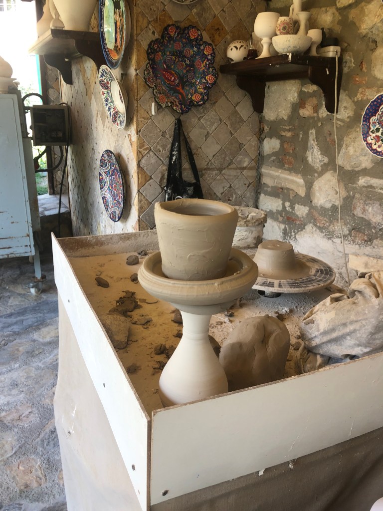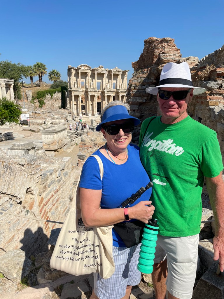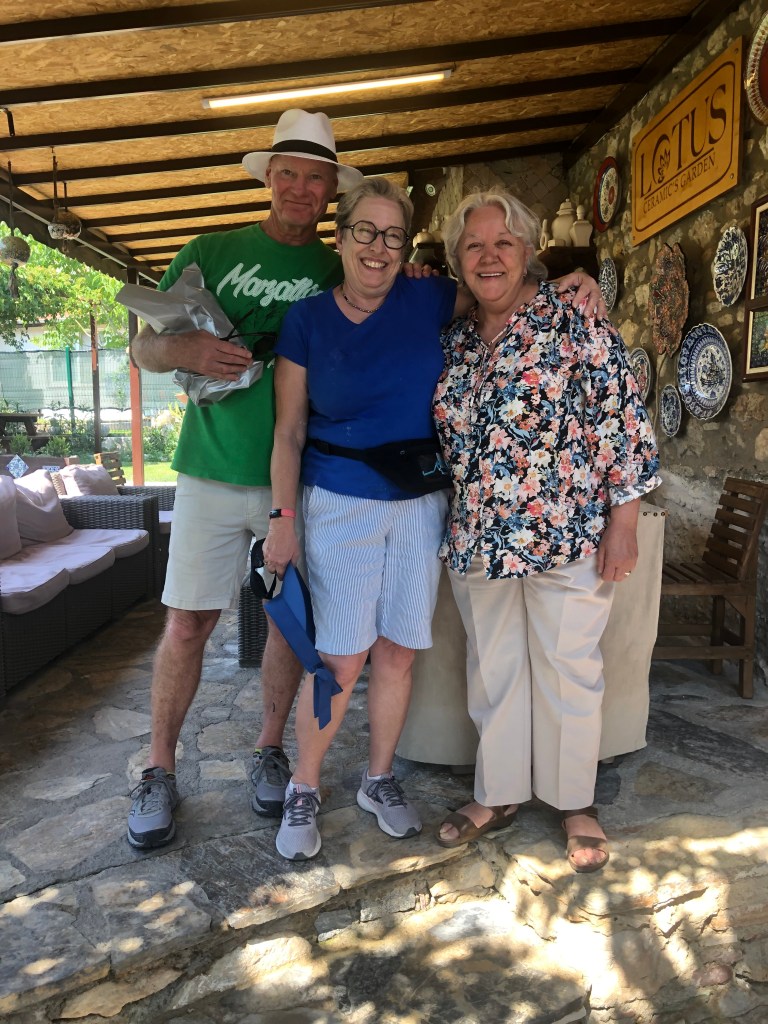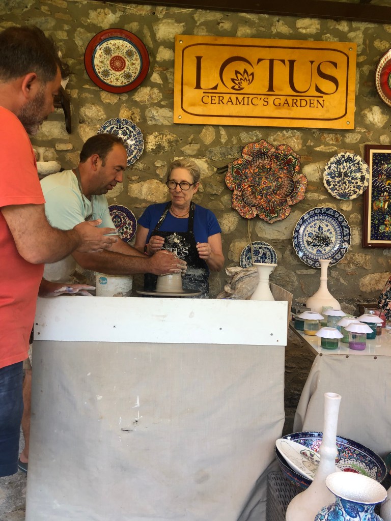 We finally ended up as we always do, at port. Because Al had sought out this private tour company (there were three buses of 6, 5 and 4 people respectively) and had booked through the same company for Istanbul, and had kept in touch all these Covid years, the grateful owner gifted us with a plate – the same pottery we had lusted over in Selcuk. The real deal, not fake souvenir shop stuff. Not moonstone but we’ll take it. What a lovely momento and it will join our dining room wall of art from our travels.