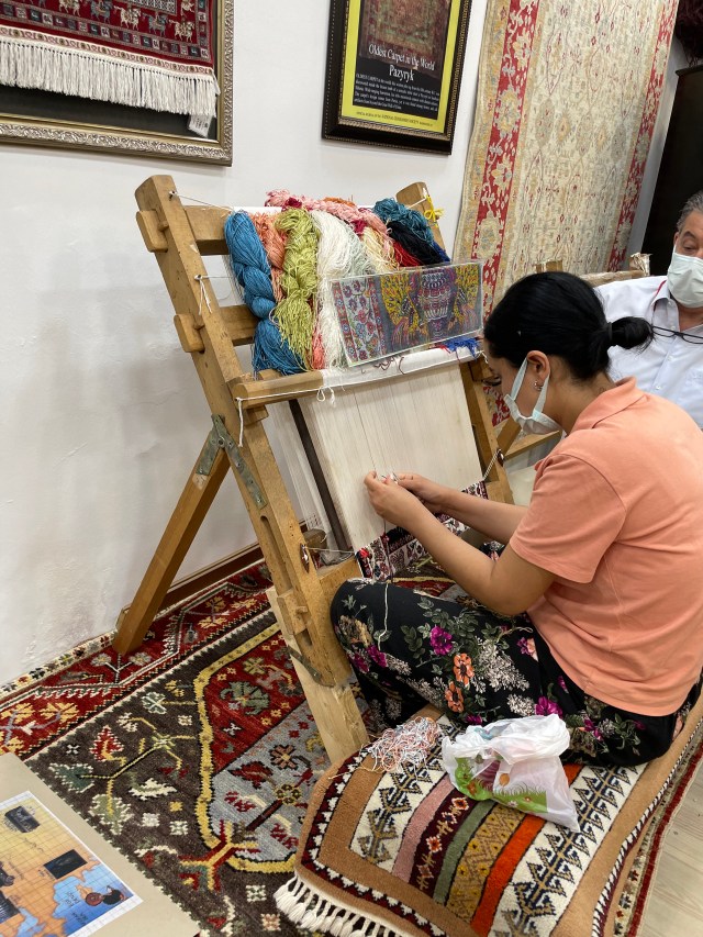 Moving on to the rug weaving. Those salespeople take one look at me and because I am thrilled by the art of it and pay rapt attention to the demonstration of how they make them, they figure I’m in the market for a $30,000 rug. I’m not but believe me, if I owned a terraced home and was an Ephesus scion I probably would be. I know now the difference between a double knotted rug and a single knotted rug, a silk rug versus a mercerized cotton (the cotton is softer and silkier), a regular cotton and a silk/cotton combo, a wool rug, a machine made rug versus a handmade rug. I know that Turkish silk is pure white because they feed them mulberry leaves. There is a mile of silk thread in a single cocoon. I wish I needed a rug. They are indescribably luscious and colorful.