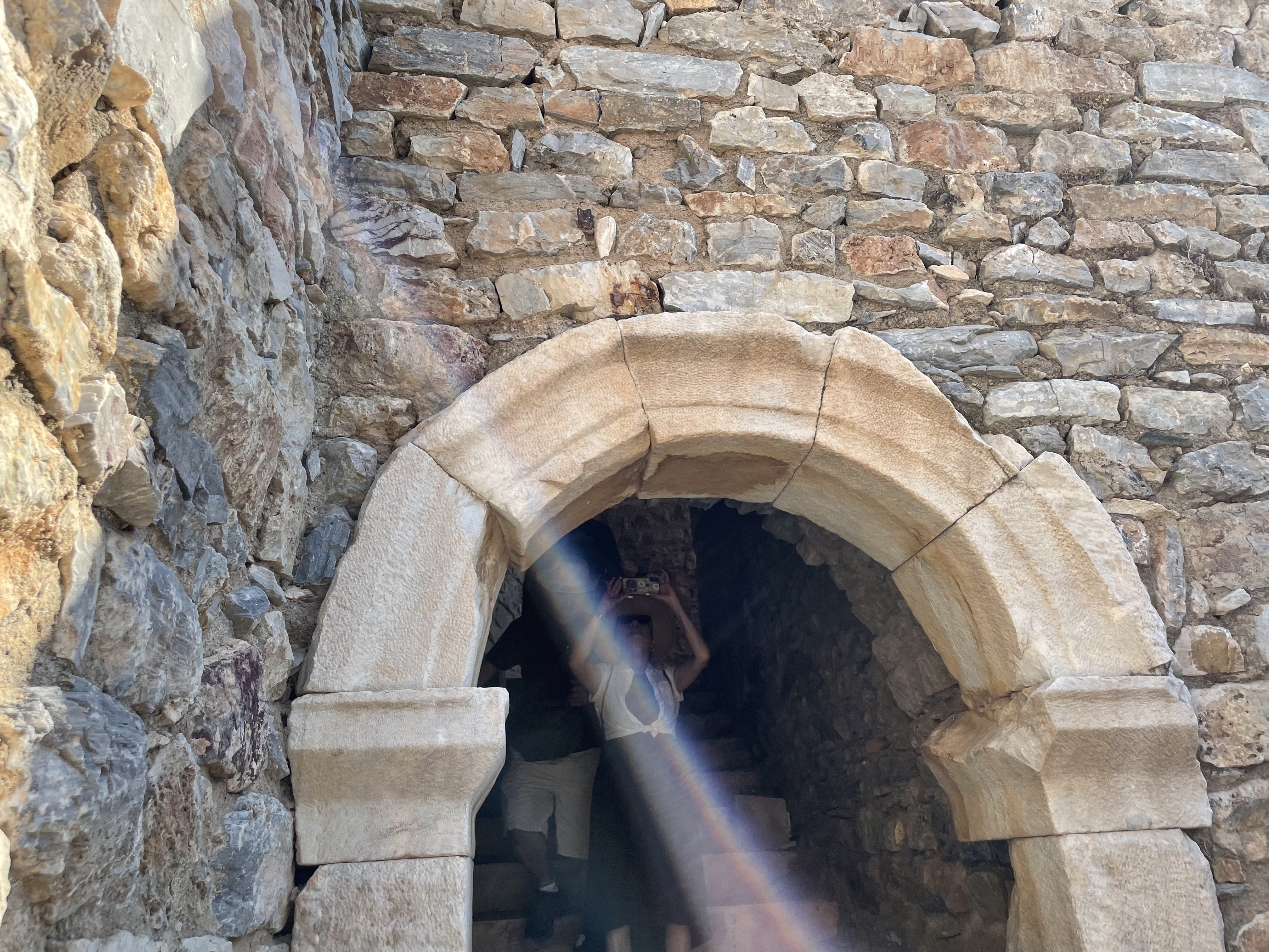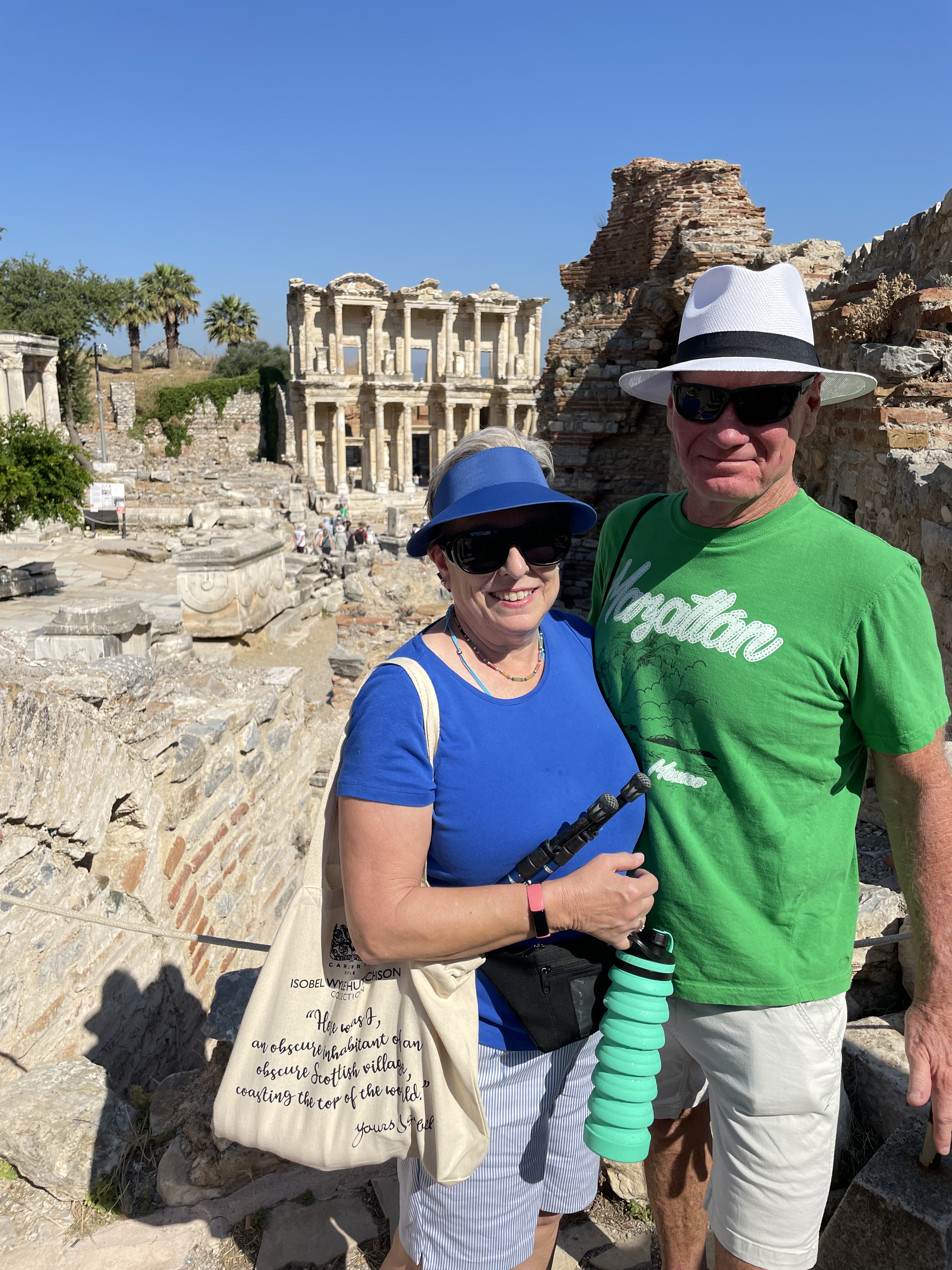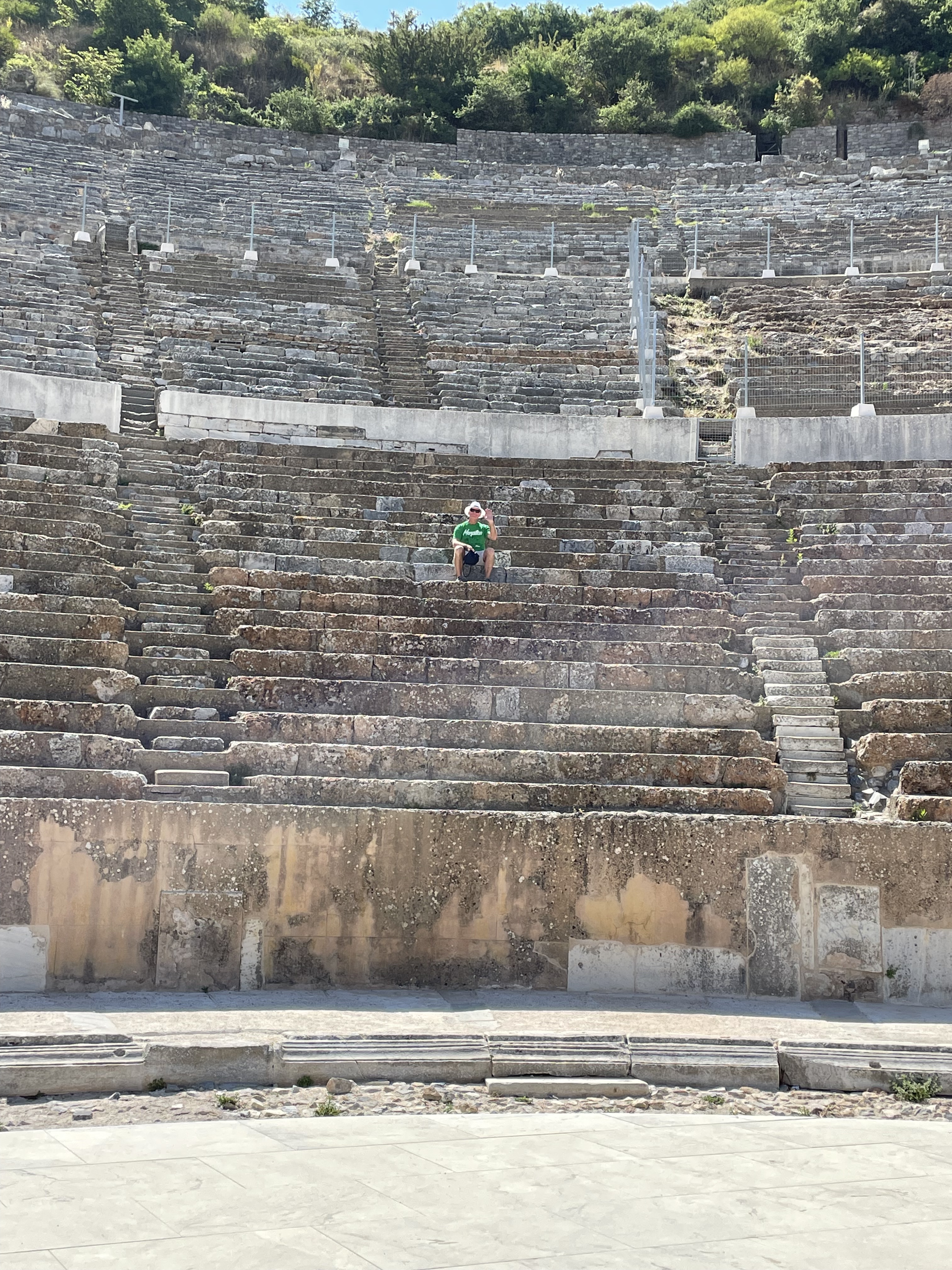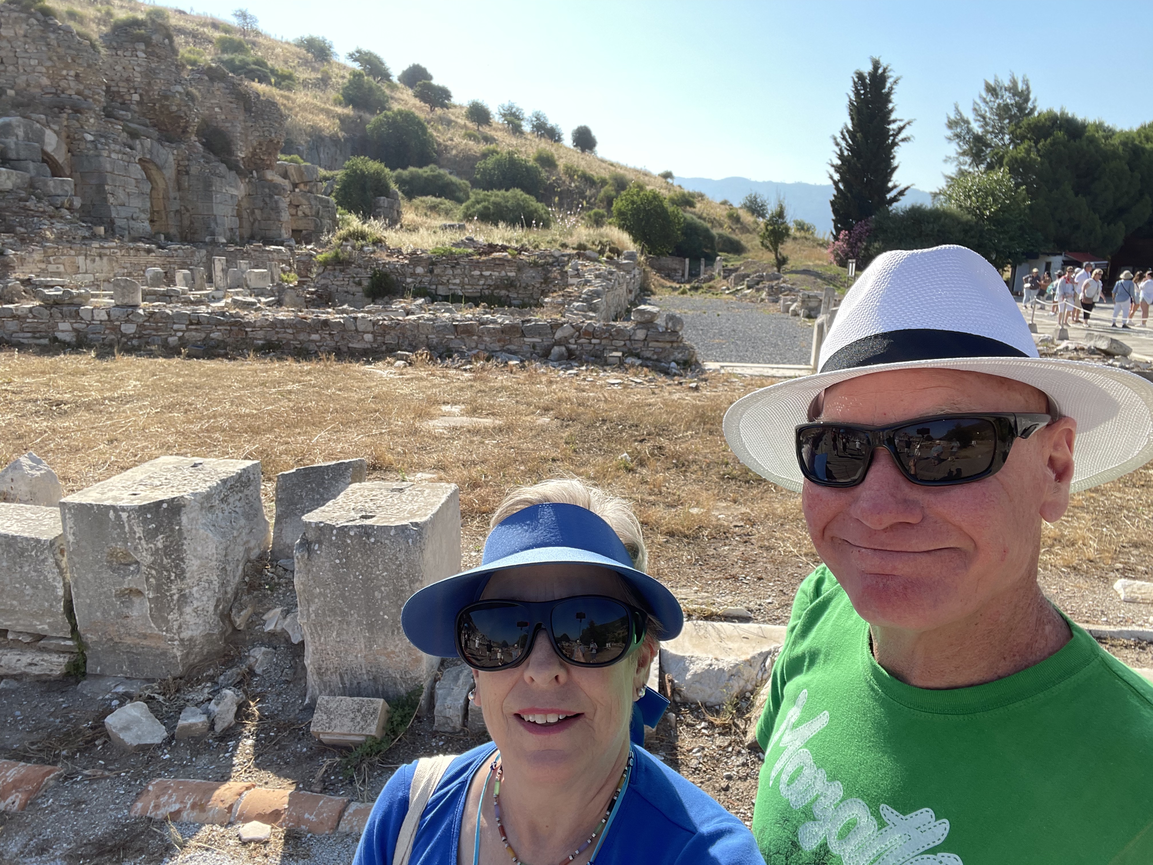 There were main streets and public toilets and bathhouses and promenades with tiled sidewalks that went past shops. It had huge agoras where the food was sold, it had a gymnasium (for the boys, of course) and brothels for the sailors. (They know this because of the road sign, see photos). It was the terraced houses that blew us away though. Mosaics and murals and even evidence that the homes had been redecorated with several layers of plaster on the walls with new artwork. There were antiques from the Egyptians (any antique collectors out there? We weren’t the first…) Marble tables. Sculptures. These people had big bucks. With help from many corporate benefactors from all over the world and even Virginia Tech modern diggers were able to build a 6 million dollar roof over the terraced homes that have been excavated to protect them from decay. It is fascinating to see how they are putting literal puzzle pieces together of walls and floors and then putting them back where they belong. Tables and tables of puzzle pieces. They have not been able to work there since Covid but are expected to be able to come back later this month. I can’t imagine being able to do such exciting work as putting puzzles together and then having to just stop. I get obsessed doing a jigsaw puzzle on my dining room table and there’s no real importance in that. There will be photos of this and although they know there is much much more under those hills, when they complete this restoration that will be the end of it. Unless someone comes a long with more millions.