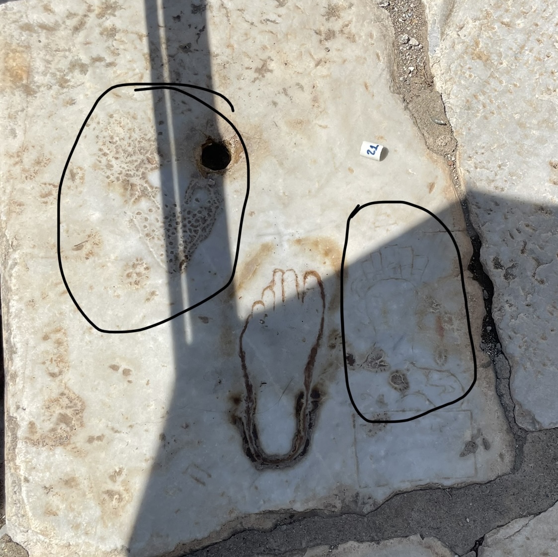 The brothel sign in the photo. It was a seaport and the sailors were welcomed as sailors often were and are. The footprint was the size your foot had to be to enter. Circled on the right is an etching of a woman with a crown. Circles on the left is a heart. ‘Nuff said.