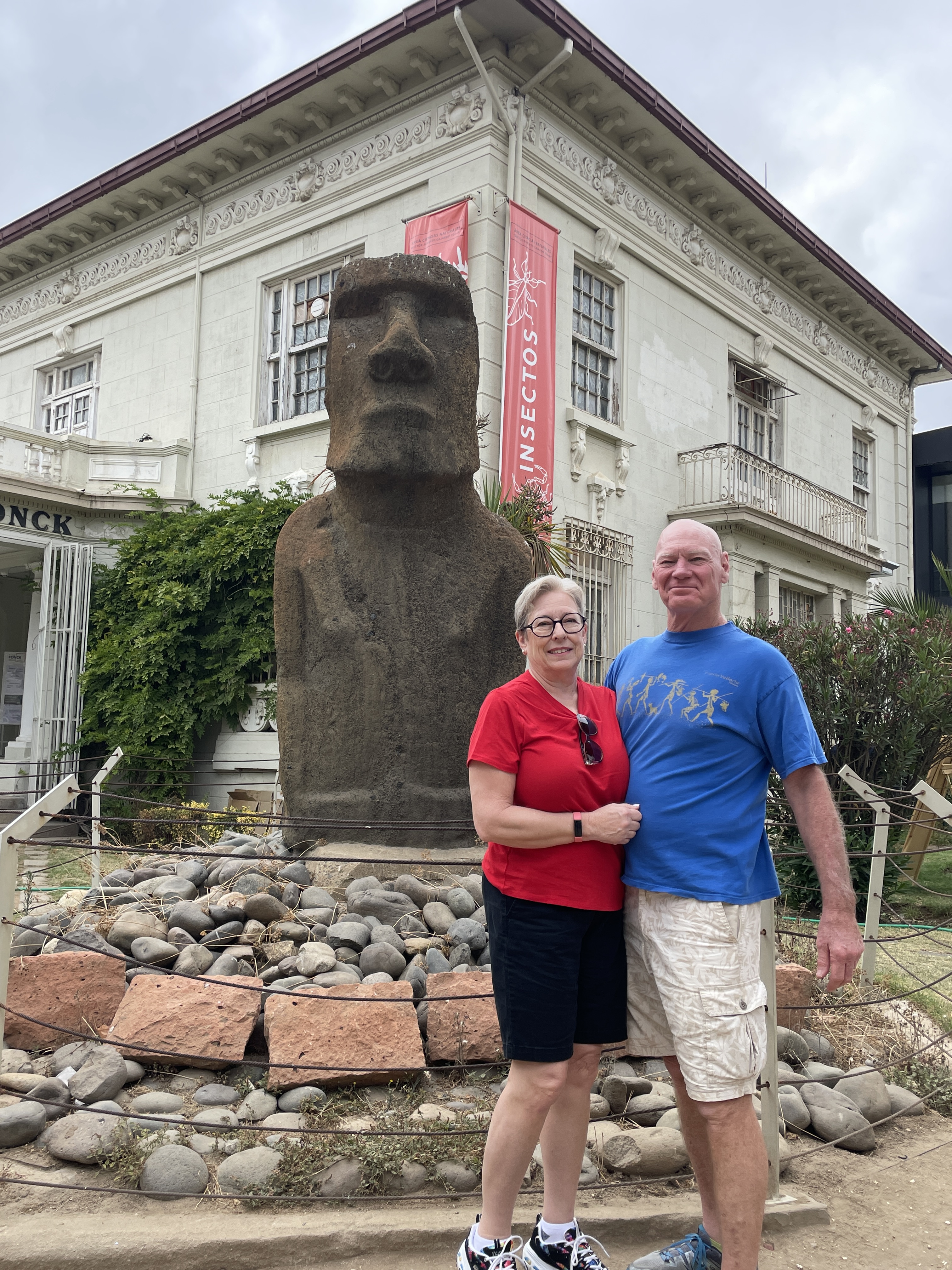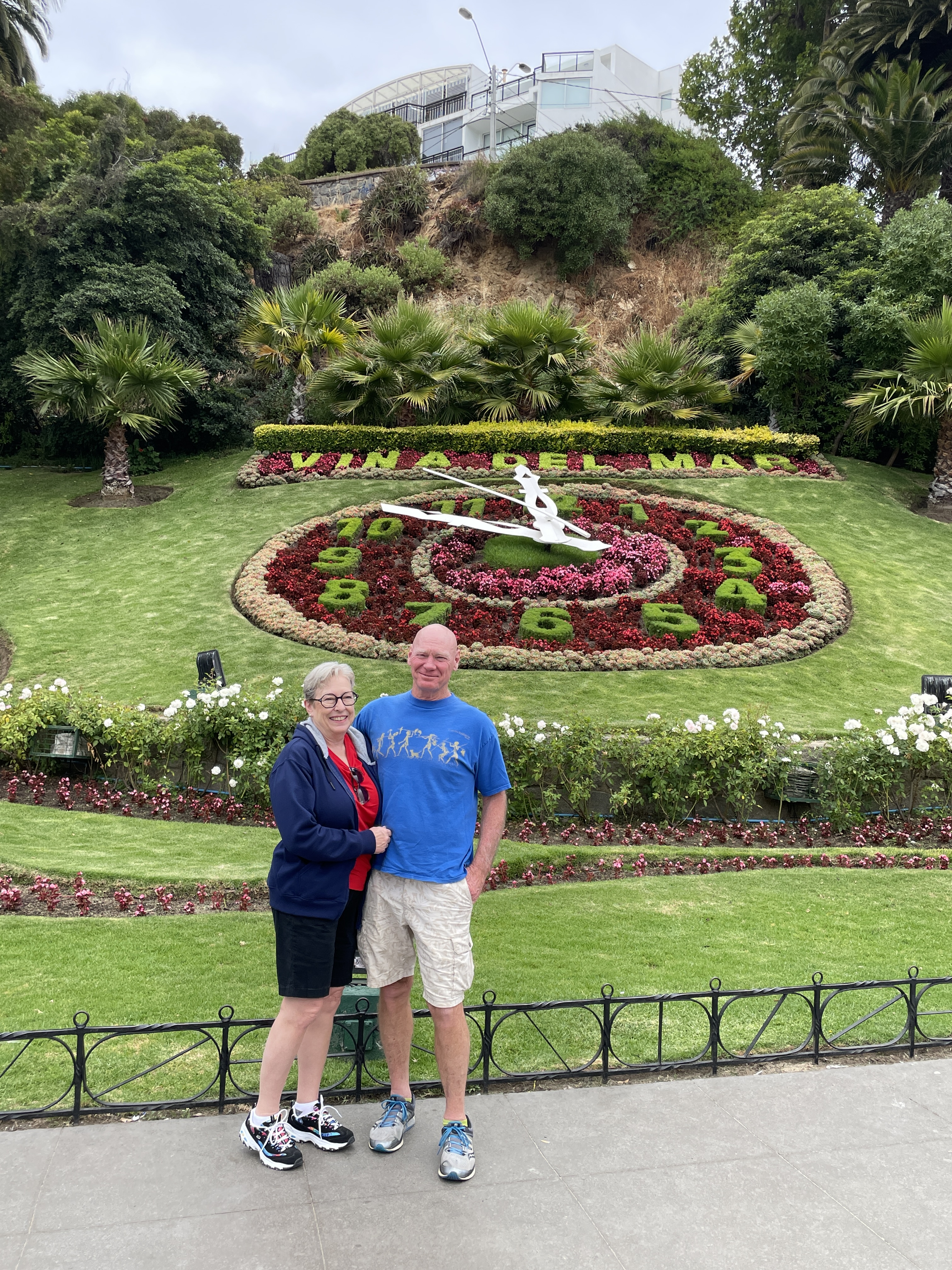 Valparaiso is an old port town that I can best describe as a San Francisco’s twin. First, we swung through Vina del Mar, an artsy community, with a stop at the Fonk Museum – we did not go inside but did see an Easter Island carving that is only one of two outside of the island itself. (You’ll never guess where the other one is. London. They stole everything and like the pieces of the Parthenon they took home with them, there is a push from the home countries to retrieve their heritage). It’s a small one but we were given a mini-lesson on the whole Easter Island Rapa Nui culture. You’ll also see a photo of us in front of a huge flower clock which is a tribute to the 1962 World Cup held there in Vina del Mar.(Pele played then, may he RIP). It evebn has a sweep second hand!