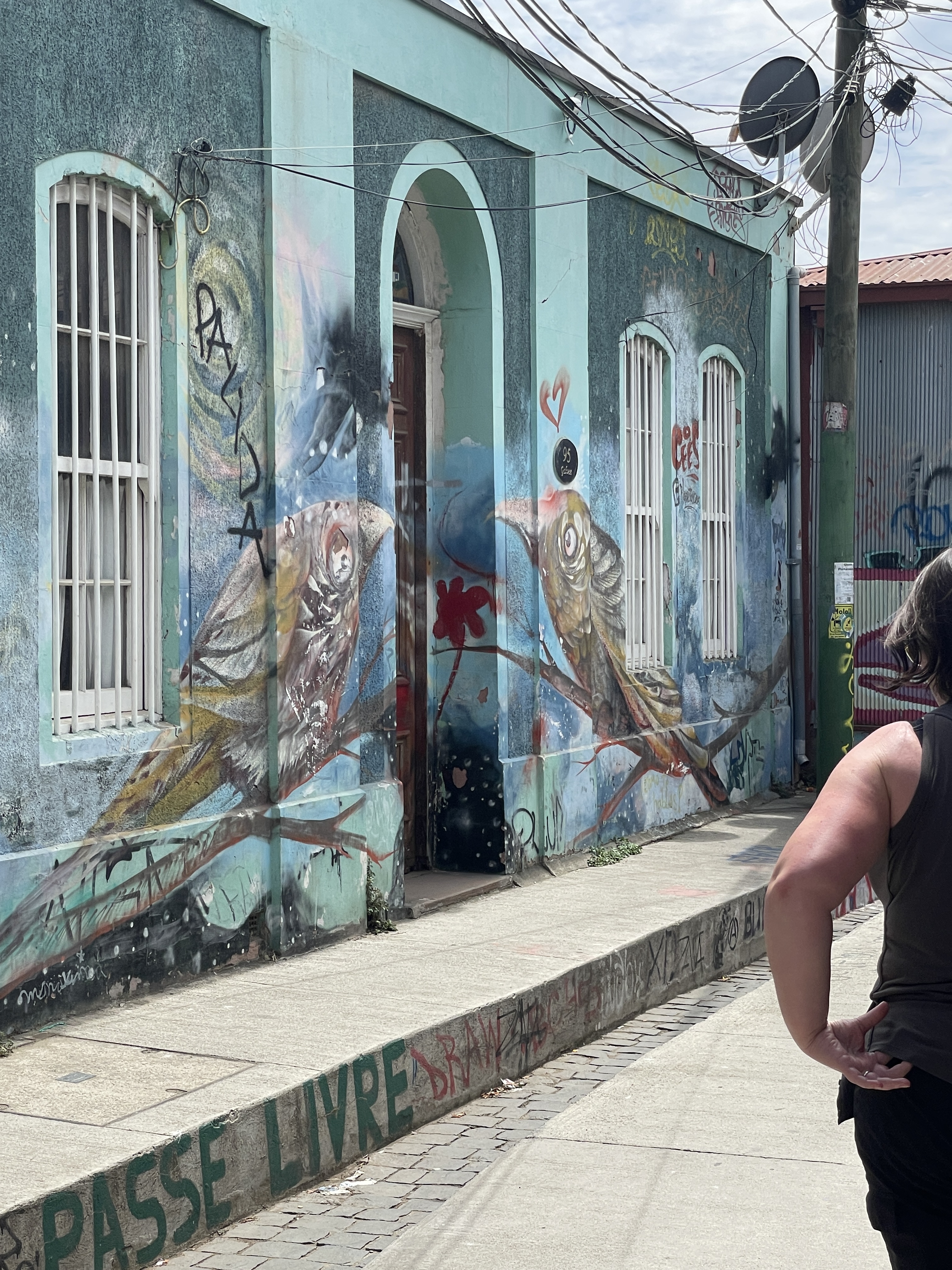 Then we went on walking tour through the beautiful graffiti-ed walls of Valparaiso. When I had noted that some of the graffiti in Santiago was quite beautiful our guide said there is a fine line between graffiti and art in Chile, Again, the views and steep streets made us feel like we were back home in San Francisco. Looking at the art I couldn’t help but think maybe some hallucinogenic use is still happening in practice but I loved every minute of the colorful street art. One artist, V. Clave Hanus, is making a name for herself and is now studying art internationally. We were told if we find her Instagram account we can see her progression from graffiti artist to accomplished muralist.